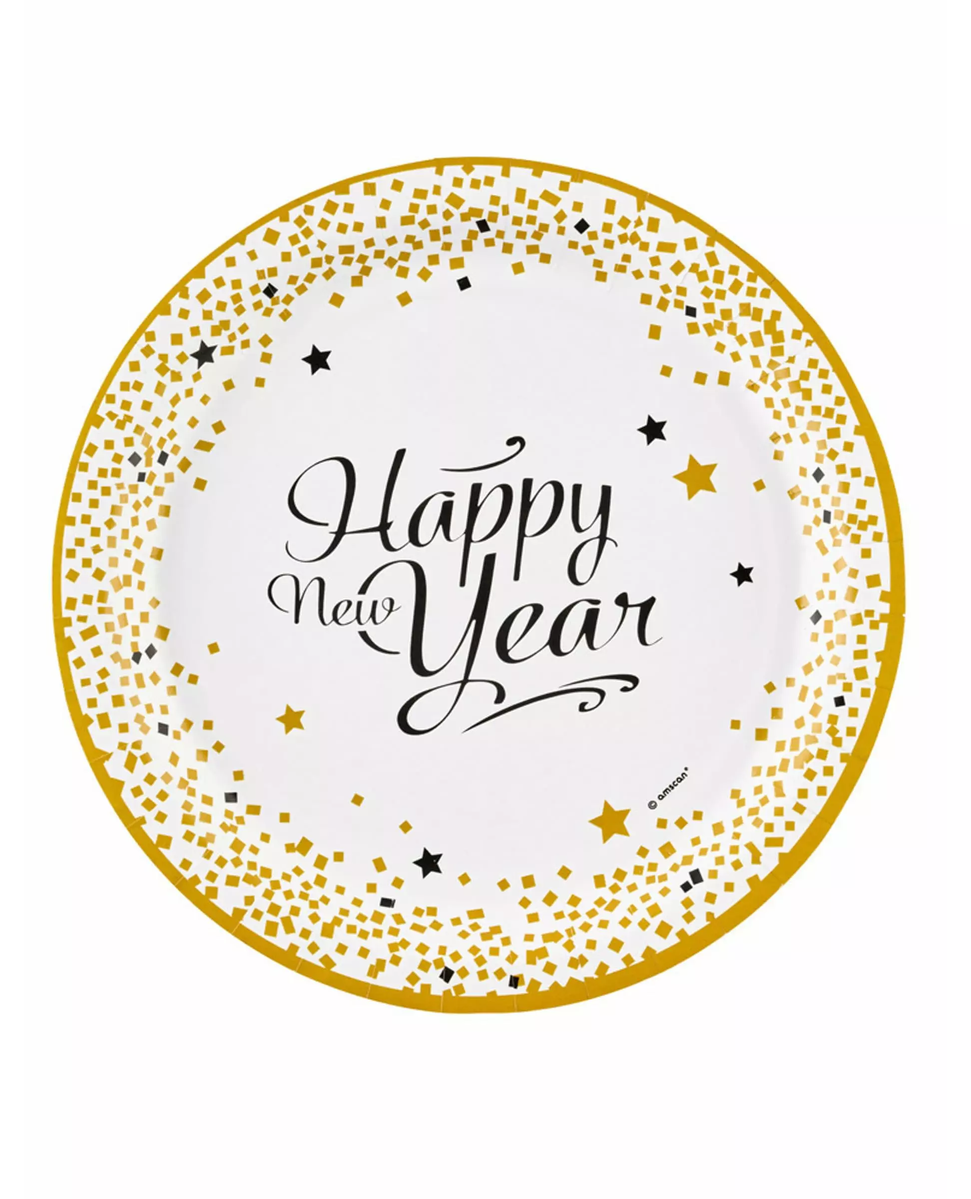 8 gullfargede papirtallerkener med godt nyttårsmotiv, 23 cm