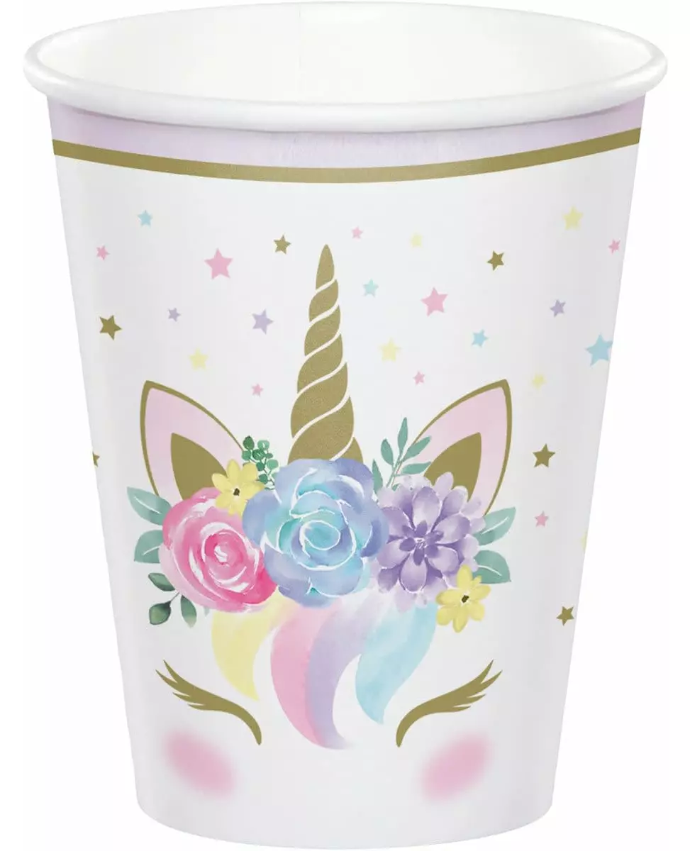 For søte og magiske drinker! Dette settet inneholder 8 kopper på omtrent 266 ml. De er laget av papp og dekorert med en pastellfarget og gullfarget enhjørning med små fargede stjerner og en rosa og gullkant. Nipp til drinkene dine i disse koppene til en enhjørningsbursdag! Inkludert tilbehør: 8 kopper Materiale: Papp