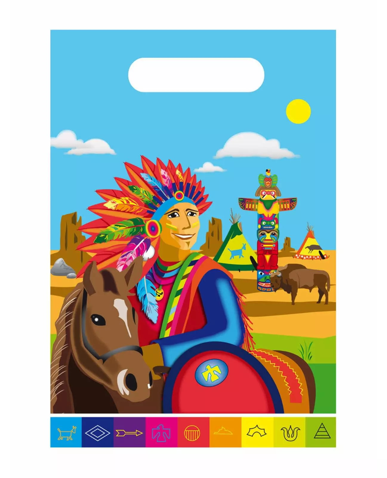 Bleke ansikter kommer i fred! Denne pakken inneholder 8 plastposer for fest. De måler omtrent 24 x 17 cm. De er trykket med et design som viser en indisk setting med en totempåle, tipier og en indianer i forgrunnen. Fyll godteposene dine med godbiter og gi dem til barna på en indisk bursdagsfest. Inkludert tilbehør: 8 godteposer Materiale: Plast