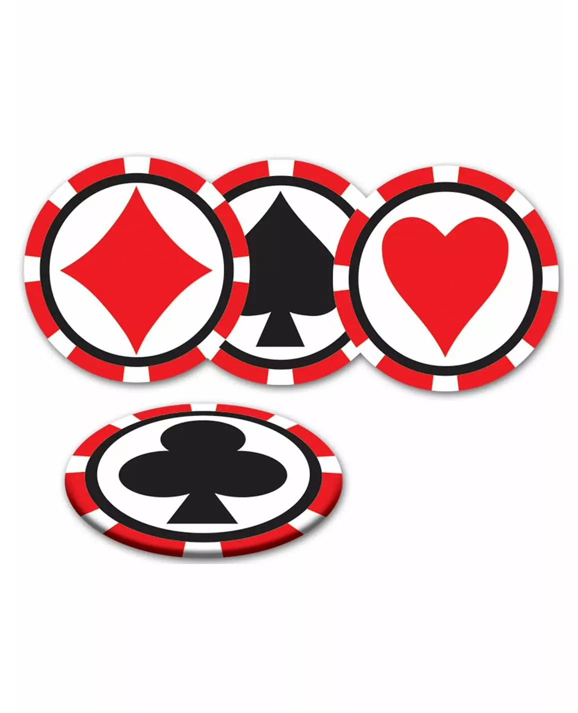 Sett med 8 brikker med kasinosjetonger, med hjerter, spar, ruter og kløver som motiver, 8,9 cm i diameter. Perfekt for å beskytte bordet ditt samtidig som du beholder stemningen på kvelden!. Inkludert tilbehør: 8 brikker