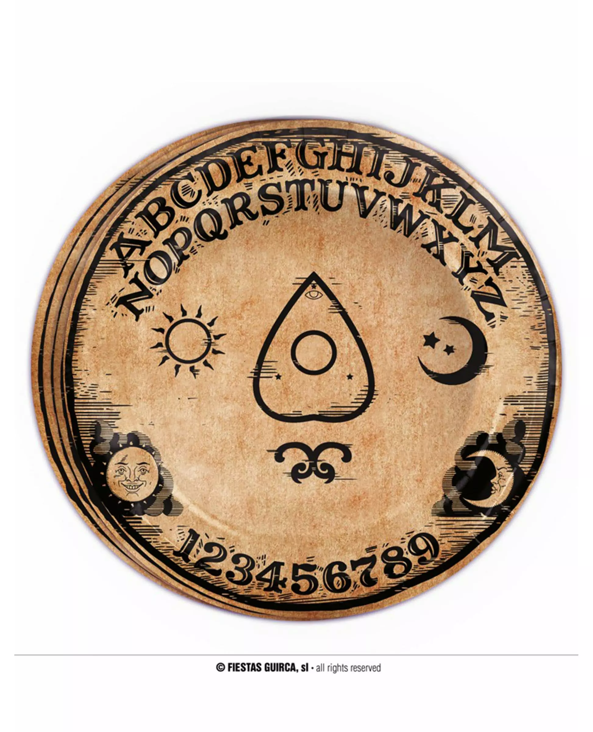 Hvis du snakker med ånder, benytt anledningen til å invitere dem på middag! Disse 8 Ouija-pappetallerkenene måler 23 cm i diameter. I likhet med det ekte åndebrettet har tallerkenene bokstavene i det latinske alfabetet, de 10 arabiske tallene, solen, månen og dråpen. Tallerkenene er brune og imiterer treverket til ekte Ouija-brett. Ta med disse tallerkenene for å dekorere bordet ditt til din neste Halloween! Inkludert tilbehør: 8 tallerkener Materiale: Papp