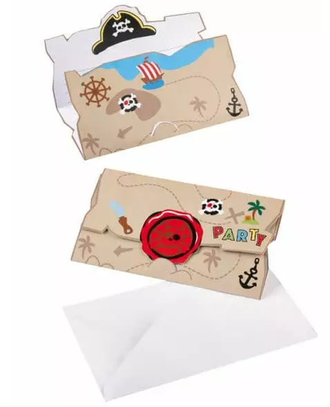 Til din lille piratbursdag! Dette settet inneholder 8 pirat-invitasjonskort med 8 konvolutter. Invitasjonskortene er laget av papp og måler omtrent 7,5 x 14 cm brettet. De har et skattekartdesign med en veldig realistisk rød bøtte på utsiden. Inni er det stiplede linjer for å skrive invitasjonsmeldingen din. Konvoluttene er laget av hvitt papir. De måler omtrent 8,5 x 14,5 cm. Du kan enkelt skyve kortene inni. Inviter alle vennene dine til piratbursdagsfesten din med disse søte små pirat-invitasjonskortene! Inkludert tilbehør: 8 invitasjonskort 8 konvolutter Materiale: Papp, papir