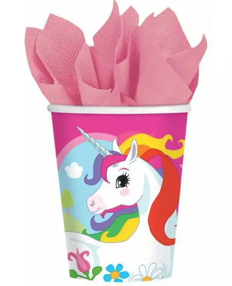 Av gårde til enhjørningsland! Dette settet består av 8 regnbuefargede enhjørningspappkrus (servietter ikke inkludert). De måler omtrent 9 cm høye og 7,5 cm i diameter. De rommer opptil 250 ml drikke. De er trykket med en hvit enhjørning med flerfarget manke foran et blomsterlandskap, alt på en fuchsia-rosa bakgrunn. Disse koppene vil være perfekte for å fullføre bursdagsbordet til datteren din! Materiale: Papp Papp