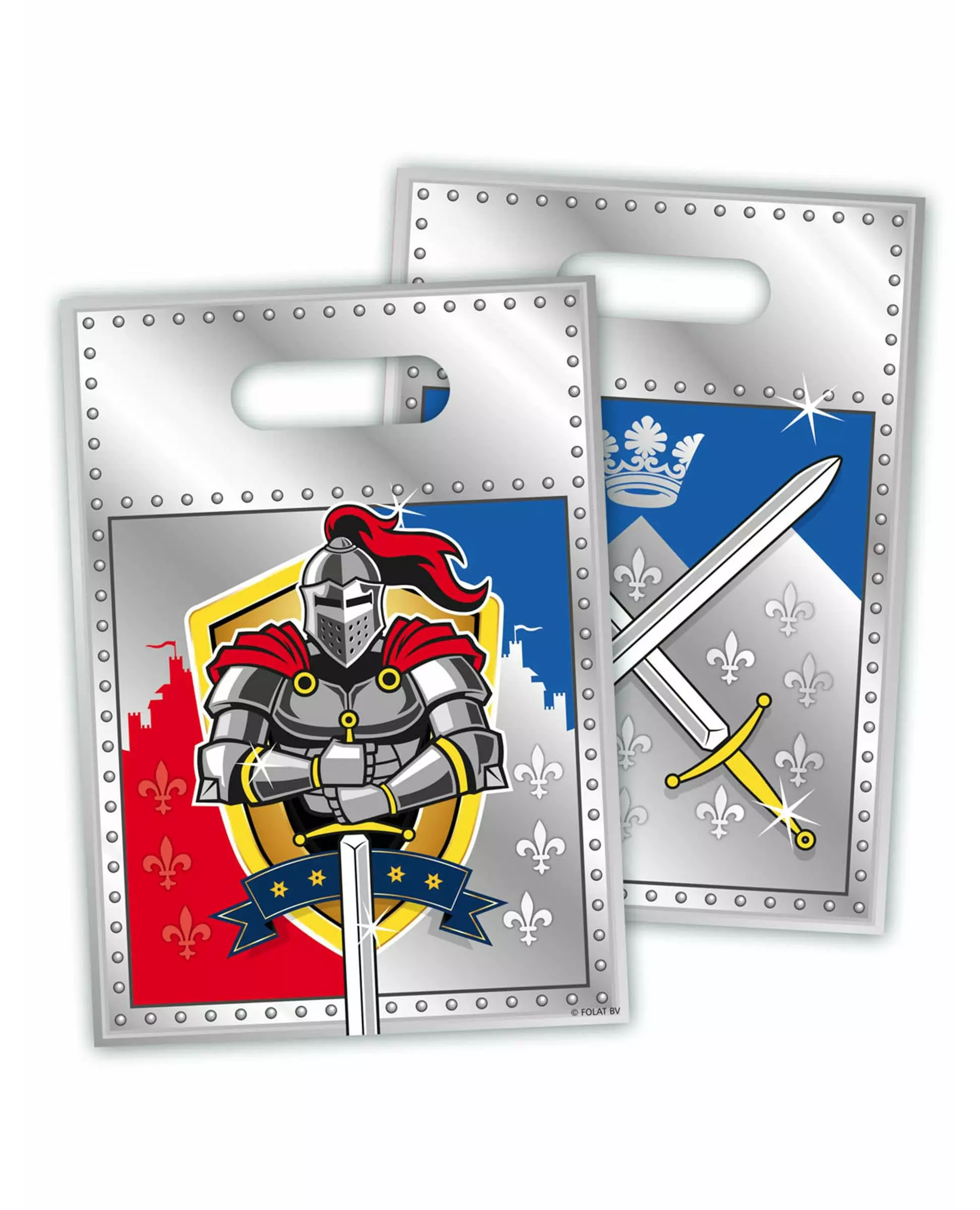 Poser til gjestene! Dette settet består av 8 poser. De er laget av lett plast og måler 23 x 16,5 cm: flotte til å putte godteri eller små gaver i! En ridder bevæpnet med et sverd og omgitt av fleur-de-lis er avbildet på forsiden, mens to sverd krysser hverandre på baksiden mot en blå og grå bakgrunn. Perfekt for å takke gjester på barnets bursdagsfest med et tappert ridder-tema! Inkludert tilbehør: 8 poser Materiale: Plast