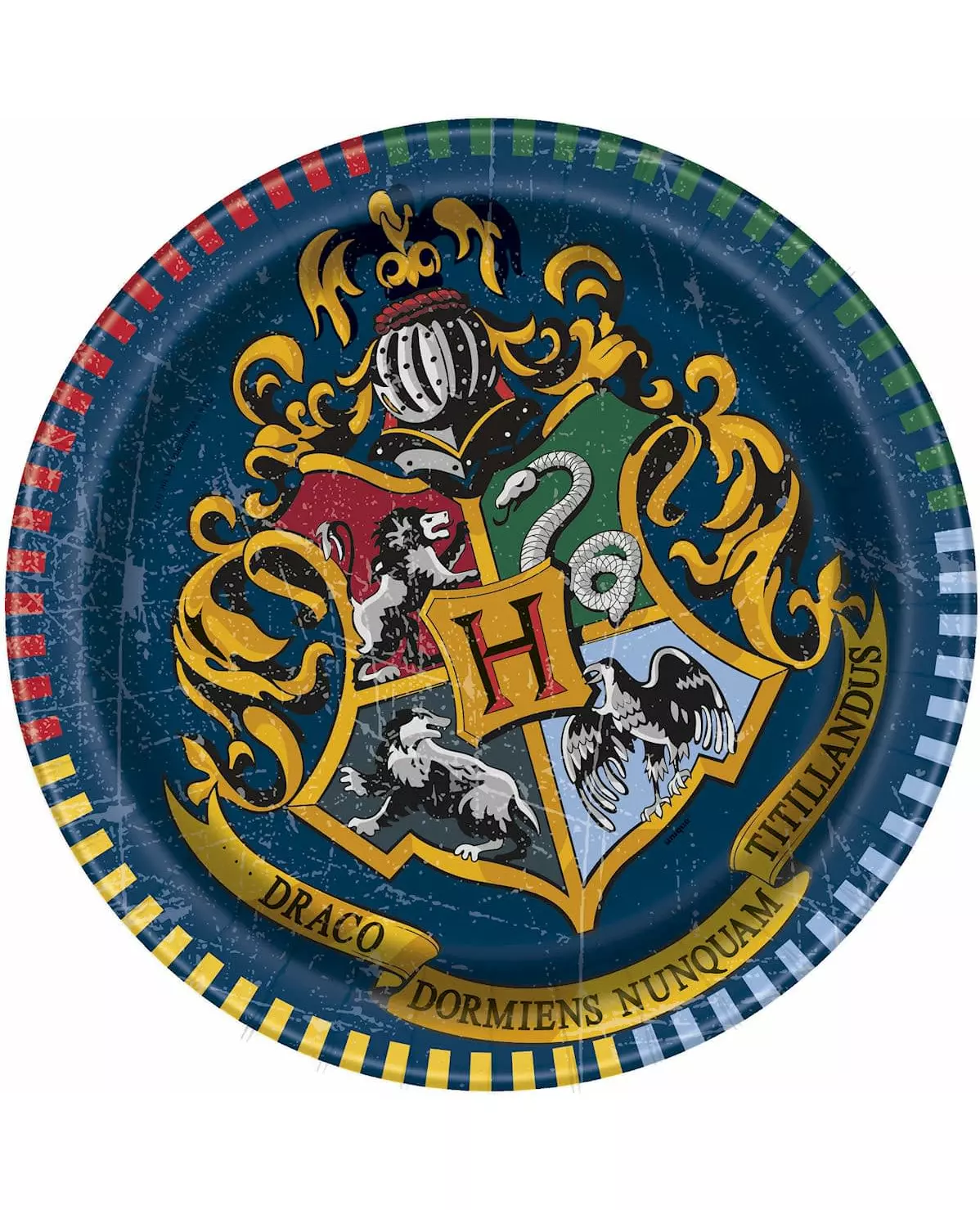 Tre inn i Galtvorts verden! Dette settet inneholder 8 små papptallerkener, offisielt lisensiert av Harry Potter®. De måler omtrent 17 cm i diameter. De er midnattsblå og har et trykk i midten som representerer Galtvorts skolevåpen med en rød H i midten og våpenskjoldene til de fire husene: Griffing, Slytherin, Ravnklo og Håsblås. Kantene er dekorert med striper i fargene til de fire husene. Skolemottoet er skrevet under våpenskjoldene: «Draco dormiens nunquam titillandus», som betyr «Ikke kil en sovende drage». Disse vakre desserttallerkenene vil være uunnværlige på bordet ditt med temaet fra den berømte Harry Potter-sagaen til barnets bursdag eller et Halloween-måltid! Unik festlogo. Inkludert tilbehør: 8 tallerkener Materiale: Papp