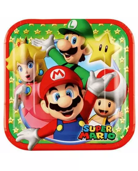 Mario og venner! Disse små firkantede tallerkenene selges i pakker på 8. De er offisielt lisensiert av Super Mario &trade. Hver tallerken måler omtrent 18 cm. De har et trykk av figurene fra: Mario, Luigi, Peach og Toad. Disse papptallerkenene vil være uunnværlige for å feire bursdagen til en liten fan av det berømte videospillet Super Mario ™. Inkludert tilbehør: 8 små tallerkener Materiale: Papp
