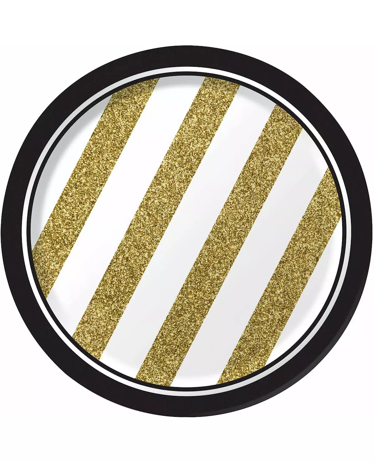Stilige tallerkener! Dette settet består av 8 små tallerkener. Disse tallerkenene er laget av papp og har en diameter på omtrent 18 cm. De har gullglitter og hvite striper på forsiden. Kanten er svart. Disse vakre tallerkenene vil perfekt utfylle borddekorasjonen din under en kveld med svart og gulltema! Inkludert tilbehør: 8 tallerkener Materiale: Papp