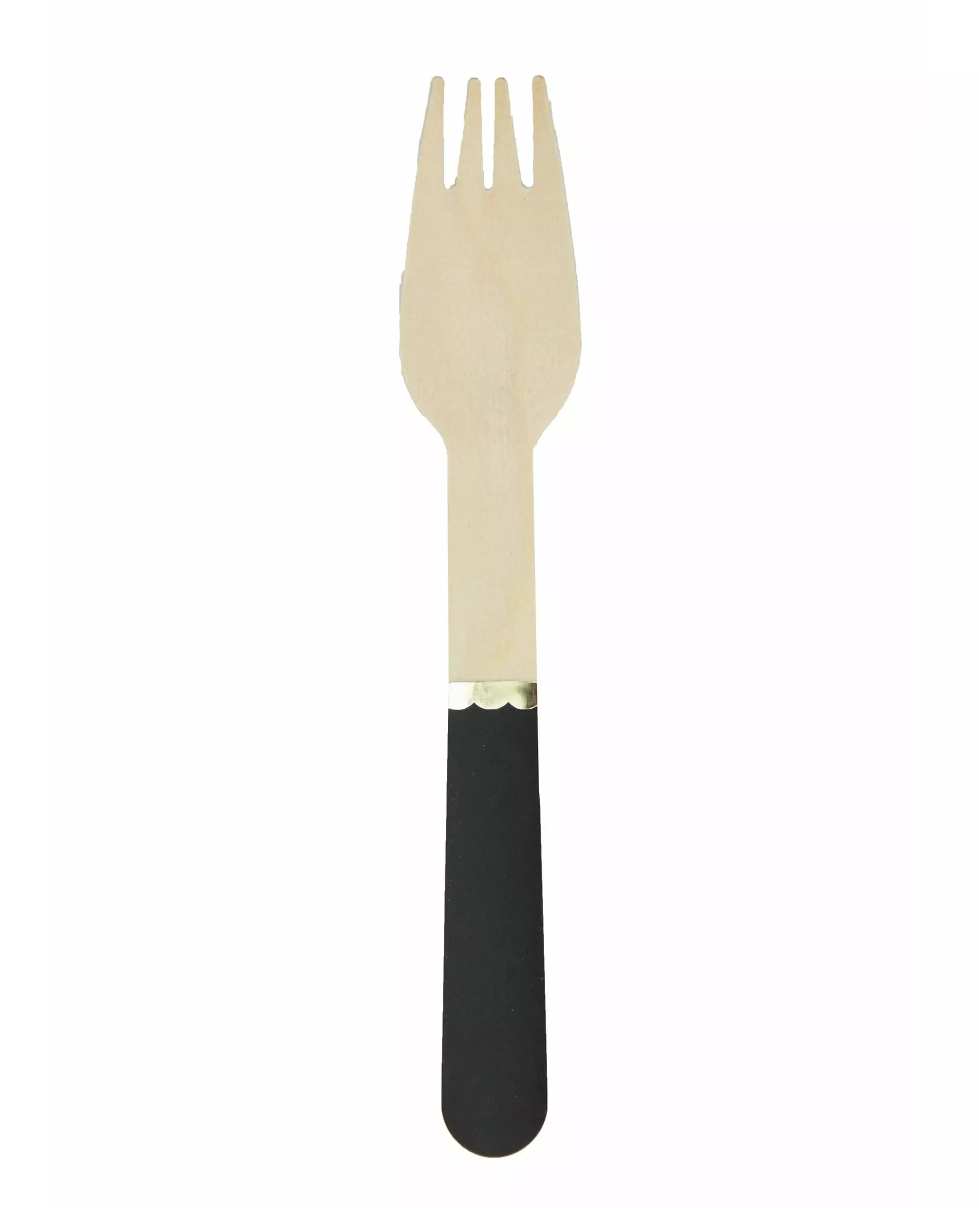 Gafler i elegante toner! Disse små trekaflene selges i sett på 8. De er omtrent 15 cm høye og har et svart og gullfarget håndtak. Bruk disse gaflene til en bursdag eller Halloween!. Inkludert tilbehør: 8 gafler Materiale: Tre
