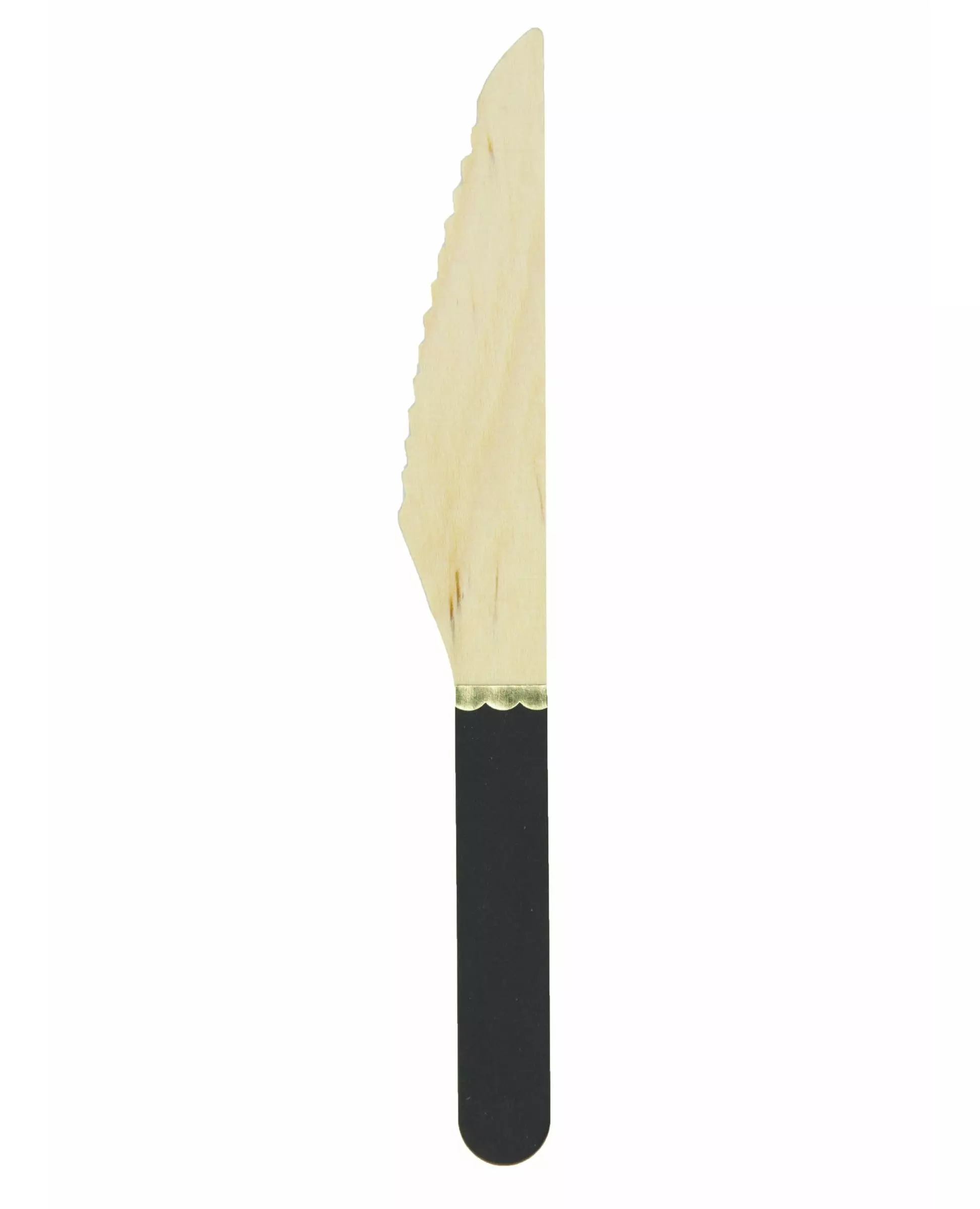 Miljøvennlige kniver for et elegant bord! Dette settet inneholder 8 trekniver. De er omtrent 16 cm lange og har et svart håndtak med gullkant. Disse knivene vil være perfekte for et elegant og miljøvennlig bord, for eksempel til Halloween!. Inkludert tilbehør: 8 kniver Materiale: Tre