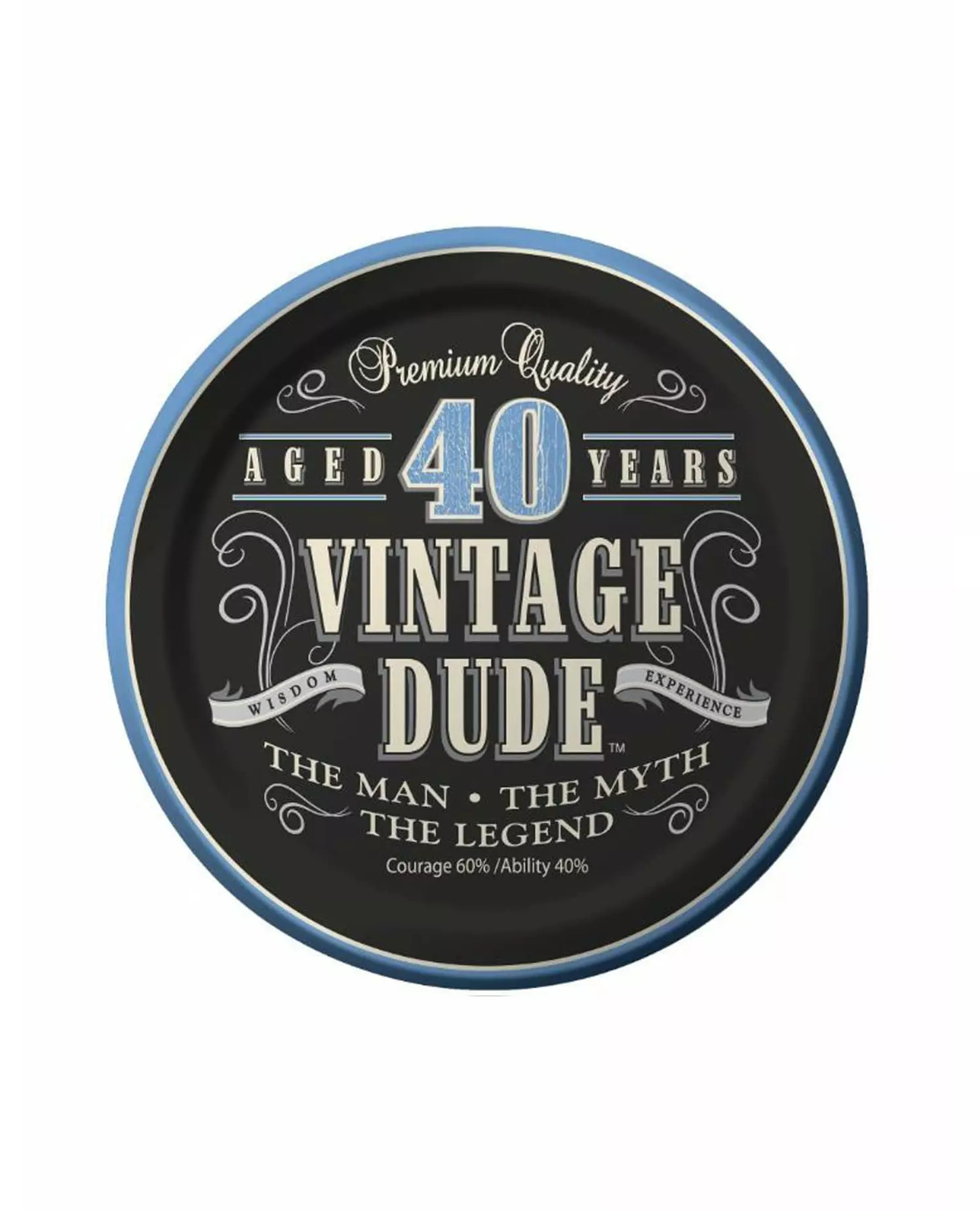 Din førtiende bursdag, kompis, det er festtid! Disse åtte små tallerkenene på 18 cm er laget av papp. På svart bakgrunn er det flere inskripsjoner på engelsk knyttet til 40 år. Typografien refererer til tiden med amerikanske salooner. Lag en flott bursdagsfest med vintage-dekor til din 40-årsdag med disse desserttallerkenene. Inkludert tilbehør: 8 tallerkener Materiale: Papp