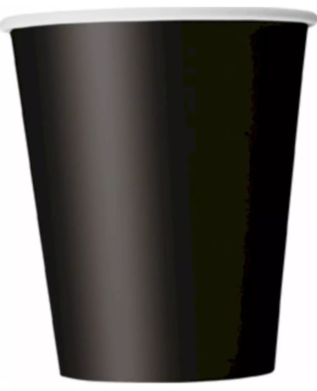 Stilige, svarte kopper! Disse svarte koppene selges i pakker på åtte. De er laget av papp og rommer 210 ml hver. De vil være perfekte for å dekorere bordet på kostymefester eller til Halloween. Unik festlogo. Inkludert tilbehør: 8 kopper. Materiale: Papp.