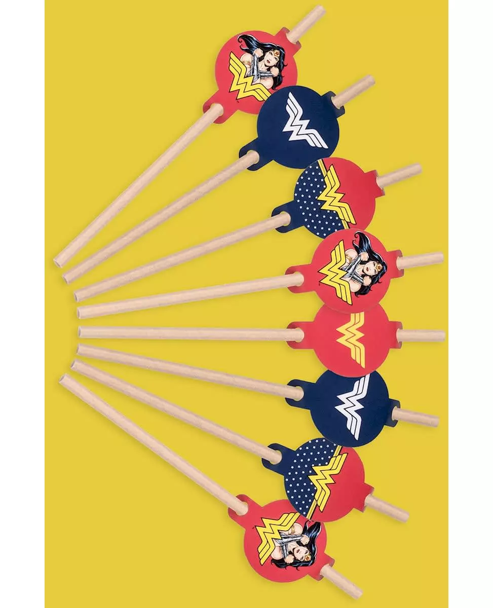 Til en heltinnes bursdag! Dette offisielt lisensierte Wonder Woman-settet inneholder 8 pappsugerør dekorert med en pappmedaljong og er 20 cm lange. Medaljongene representerer Wonder Woman og logoen hennes på en rød og mørkeblå bakgrunn. Disse sugerørene vil være perfekte for å fullføre borddekorasjonen din til en Wonder Woman-bursdag! Inkludert tilbehør: 8 sugerør 8 medaljonger Materiale: Papp Vedlikehold: Ikke vask