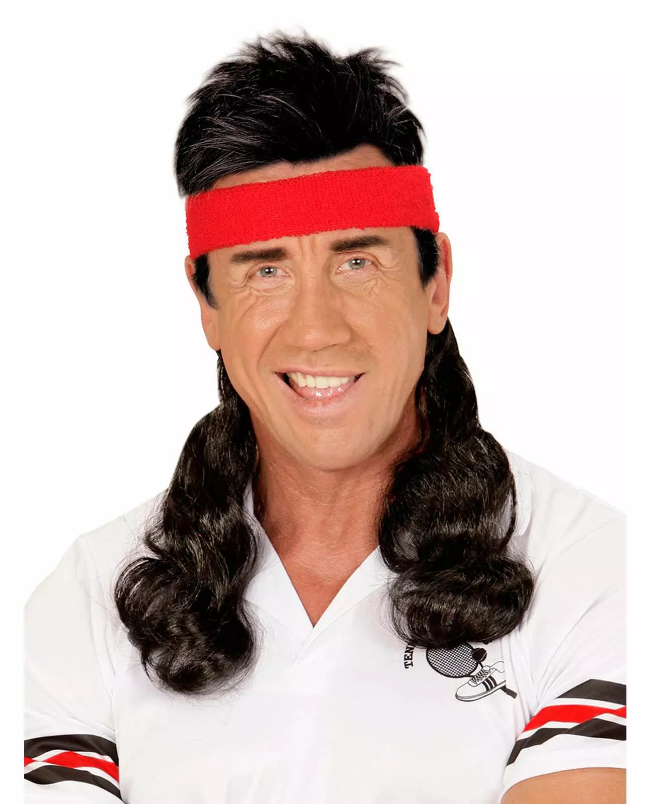 Et pannebånd til frisyre Dette mullet-hårstykket med pannebånd er et pannebånd som det er festet en lang hårstykke til. Bare ha det røde pannebåndet rundt pannen for å ha langt svart hår nedover halsen som en mullet-klipp. Dette geniale tilbehøret vil forvandle deg til en 80-talls feststjerne på karnevalet! © Copyright Widmann SRL. Inkludert tilbehør: Hårstykke med pannebånd Materiale: 100 % polyester