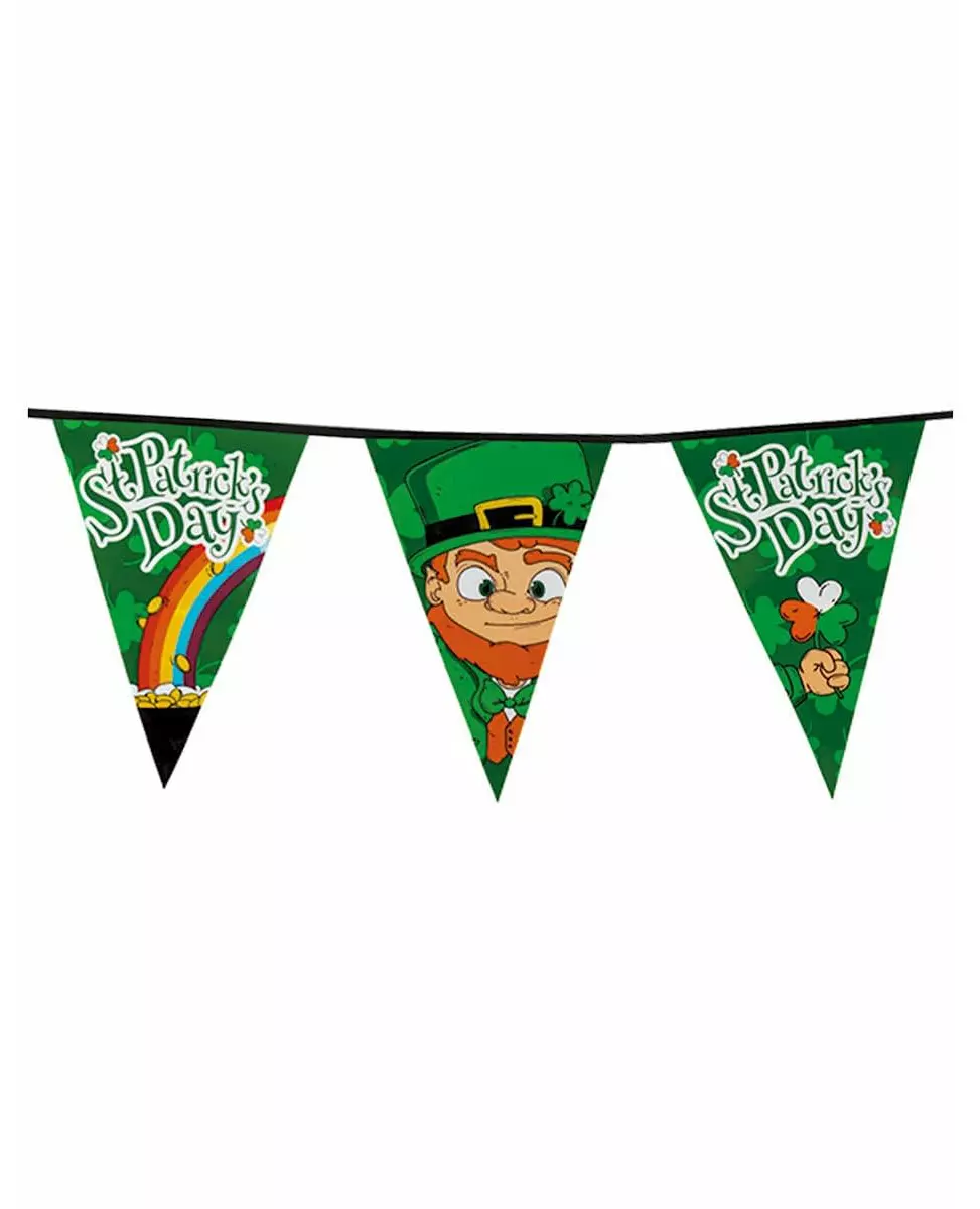 For en livlig St. Patricks dag-fest! Denne St. Patricks dag-girlanderen er laget av grønne vimpler med flere trykk. Noen har inskripsjonen «Saint Patricks Day» med en kløver i Irlands farger eller en magisk gryte ved foten av regnbuen, andre er dekorert med et leprechaun-trykk. Denne 8 meter lange dekorasjonen vil sette interiøret ditt i St. Patricks dag-stemning. Tilbehør inkludert: St. Patricks dag vimplergirlander