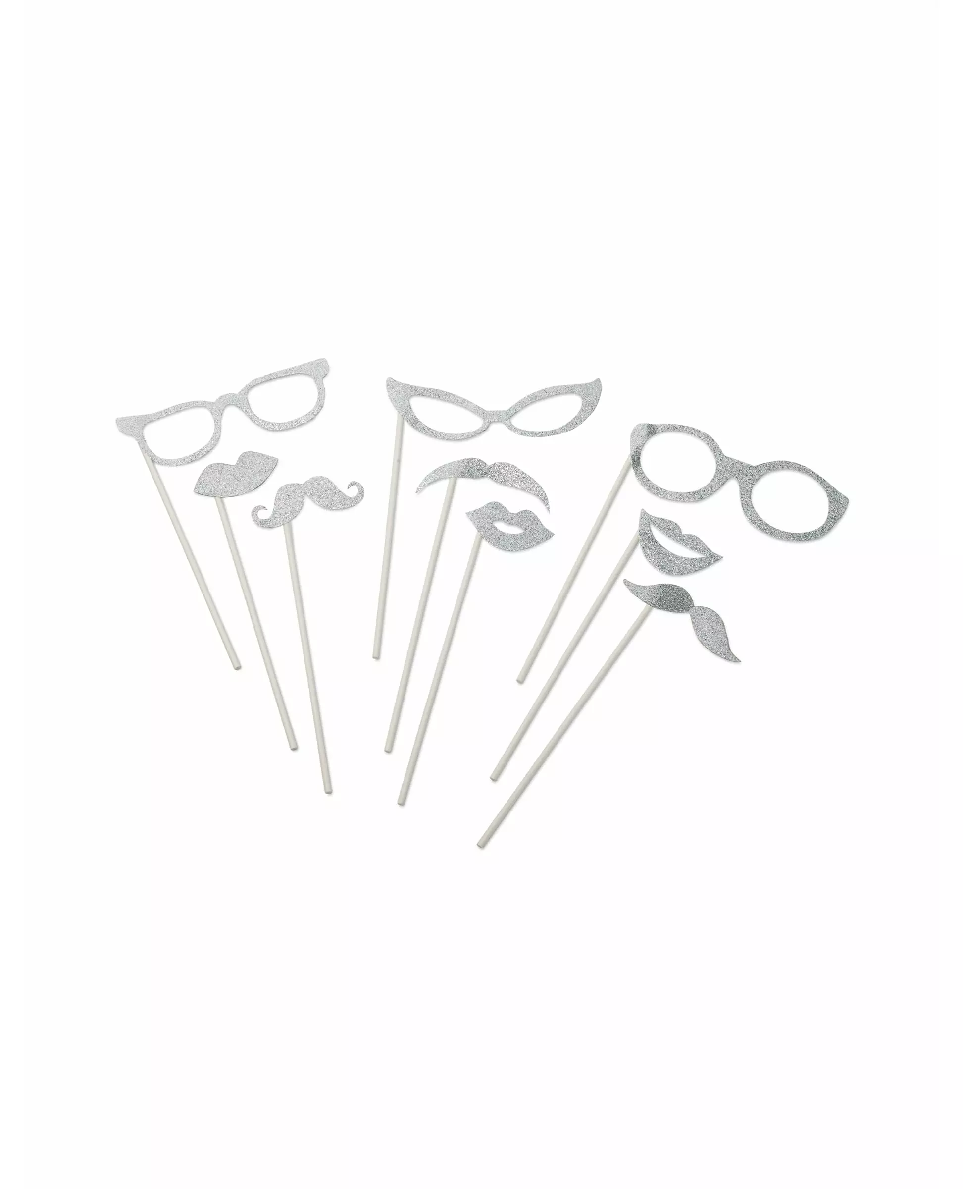En morsom animasjon! Dette settet består av 9 fotobokstilbehør laget av papp. Det er satt sammen av forskjellige modeller som følger: - 3 par briller i forskjellige former - 3 barter - 3 munner Hvert tilbehør er drysset med sølvglitter og festet til en 20 cm hvit pappstang for enkel bæring. Dette fotobokssettet vil være uunnværlig for å gjøre fotoseansene dine uforglemmelige på kveldene eller bursdagsfestene dine. Inkludert tilbehør: 9 fotobokstilbehør Materiale: Papppapir