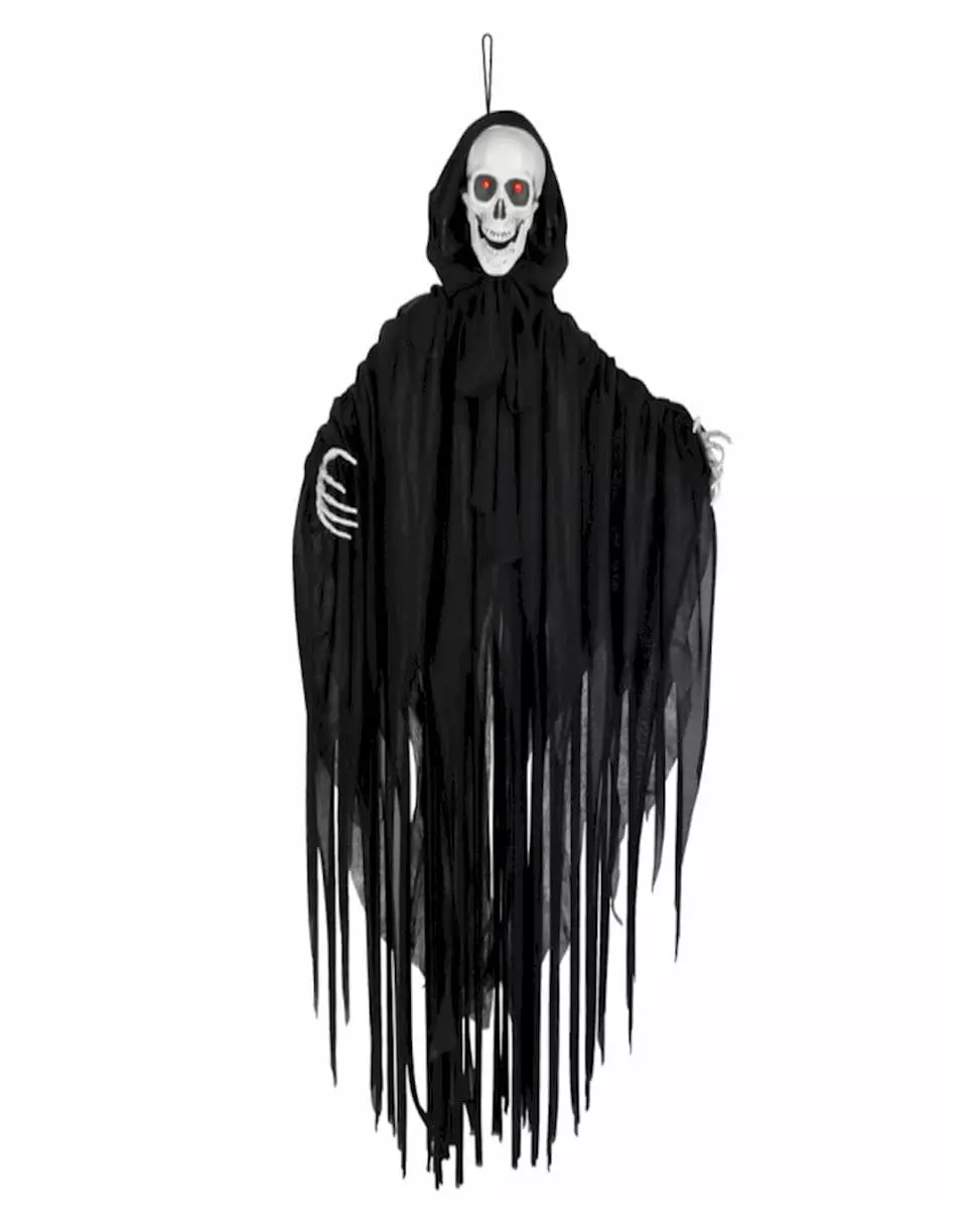 En skummel atmosfære er garantert! Dette lysende, lydaktiverte, animerte Halloween-skjelettet måler omtrent 90 cm i høyden. Denne dekorasjonen, kledd i svart, har en skjelettlignende maske med røde øyne og skjeletthender. Det revne stoffet gir enda mer skummelhet til det hele; du kan enkelt henge den hvor du vil ved hjelp av en snor plassert over skjelettets plasthode. Når spøkelset hører en lyd i nærheten, vil det begynne å bevege seg og avgi en lyd for fantastisk realisme! Du trenger 3 AA-batterier for å bruke dekorasjonen din. Denne hengende dekorasjonen vil være perfekt for å sette tonen for den skumle Halloween-festen din! Inkludert tilbehør: Animert hengende dekorasjon Materiale: Polyester og plast Vedlikehold: Ikke vask