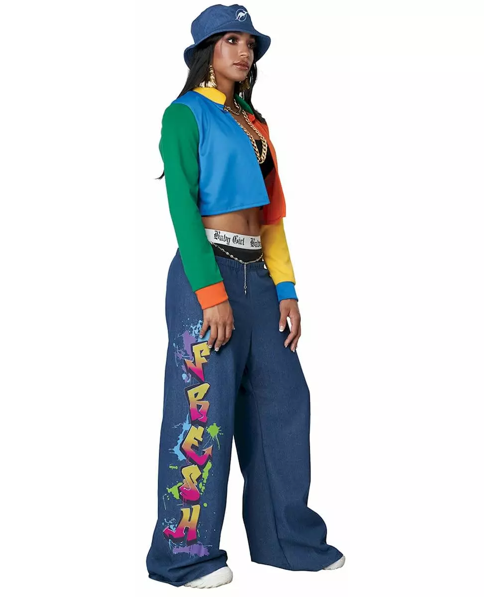 Bli med på begivenheten! Dette hiphop-kostymet fra 90-tallet er for kvinner. Det inkluderer en jakke, bukser med falske boksershortser og en hatt. Jakken er tilgjengelig i flere farger (gul, grønn, blå, oransje) og har lange ermer. Den har også en liten hevet krage. De lange buksene på kostymet kjennetegnes av sin løse bevegelsesfrihet. De er blå og dekorert med inskripsjonen «Fresh» på begge bena. En falsk boksershorts er plassert på den øvre delen og er svart og har inskripsjonen «Baby girl». Til slutt er bob-hatten som matcher settet blå med et kengurumønster på den sentrale delen. Våg å bruke dette originale og morsomme kostymet på kostymefesten din, for eksempel karnevalet eller til nyttår! Tilbehør inkludert - 1 jakke - 1 bukse med falske boksershortser - 1 hatt
