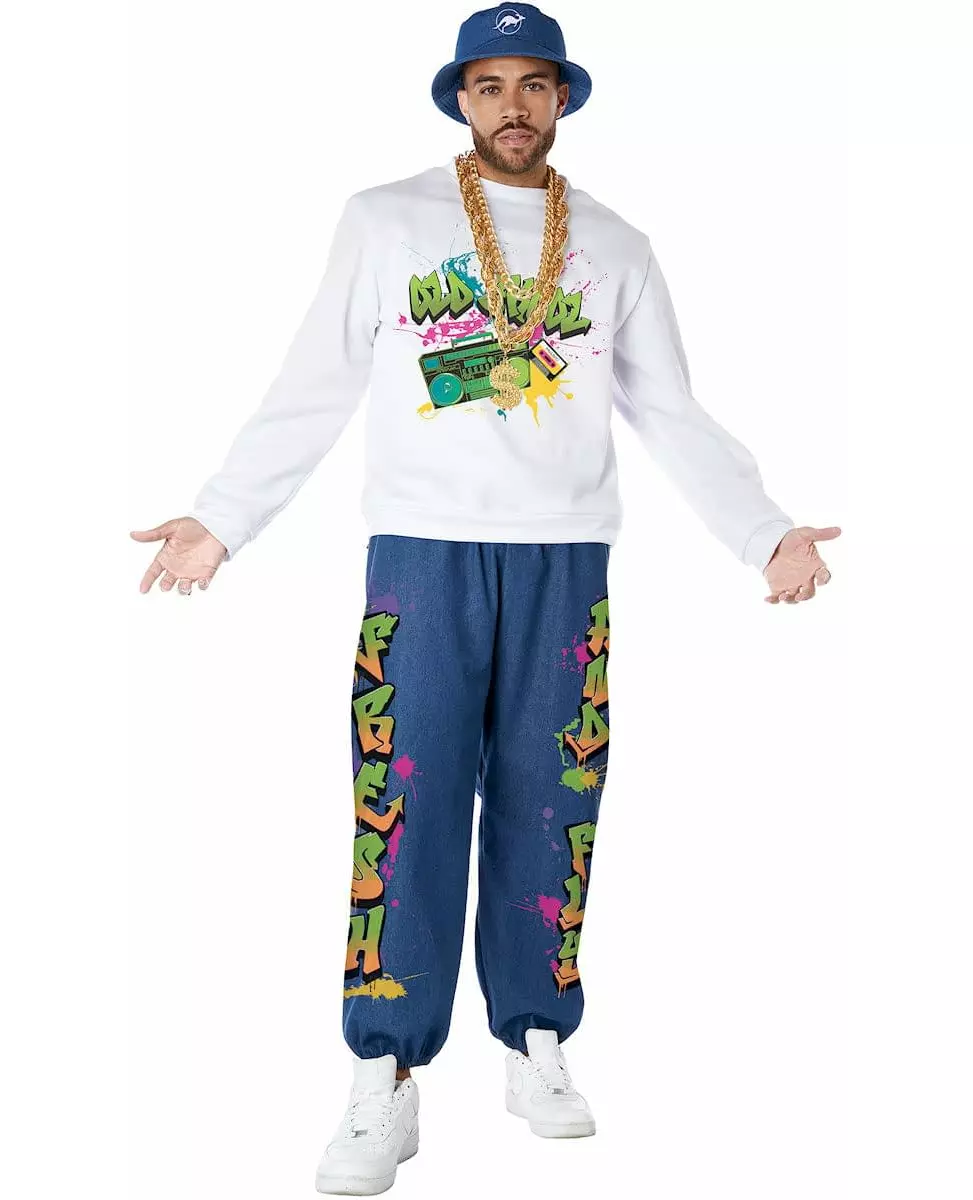 Hiphop! Dette hiphop-kostymet er for menn og består av en topp, bukser og en hatt. Toppen er hvit og har lange ermer. Den er dekorert med et grønt graffititrykk med et design av en boombox. Underdelene ligner blå joggebukser med grønn og oransje graffiti på sidene. De er strammet inn ved anklene. Bøttehatten fullfører kostymet. Den er blå med et hvitt kengurutrykk. Ta en tur tilbake til 90-tallet med dette hiphop-kostymet til en temafest eller karneval! Inkludert tilbehør: Topp, bukser, hatt, Materiale: 100 % polyester,