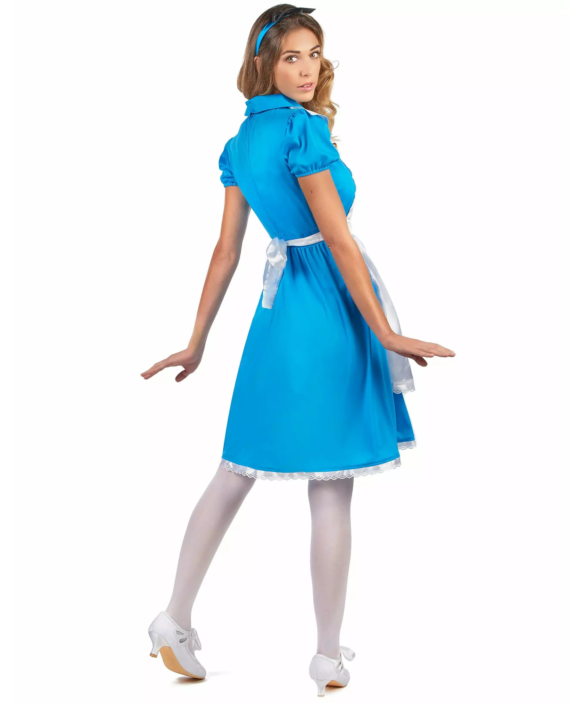 Én pille gjør din større... Alice i Eventyrland-kostymet for kvinner består av en kjole, et forkle og et pannebånd. Den blå kjolen er dekorert med en Peter Pan-krage med korte puffermer. Den lukkes bak med glidelås. En hvit satengflette pryder bunnen av kjolen. Et pent hvitt satengforkle med et spade- og hjertetrykk pryder kjolen. Et blått pannebånd med en svart sløyfe fullfører kostymet. For en dagdrømmestund, kle deg ut i Alices kostyme og dra til Eventyrland for å oppdage Dodoen og Cheshirekatten. Dette antrekket vil være perfekt for et uvirkelig karneval. Inkludert tilbehør: Kjole Pannebånd Forkle Stell: Håndvask Målinformasjon: Alice, Alice i Eventyrland, figurer,