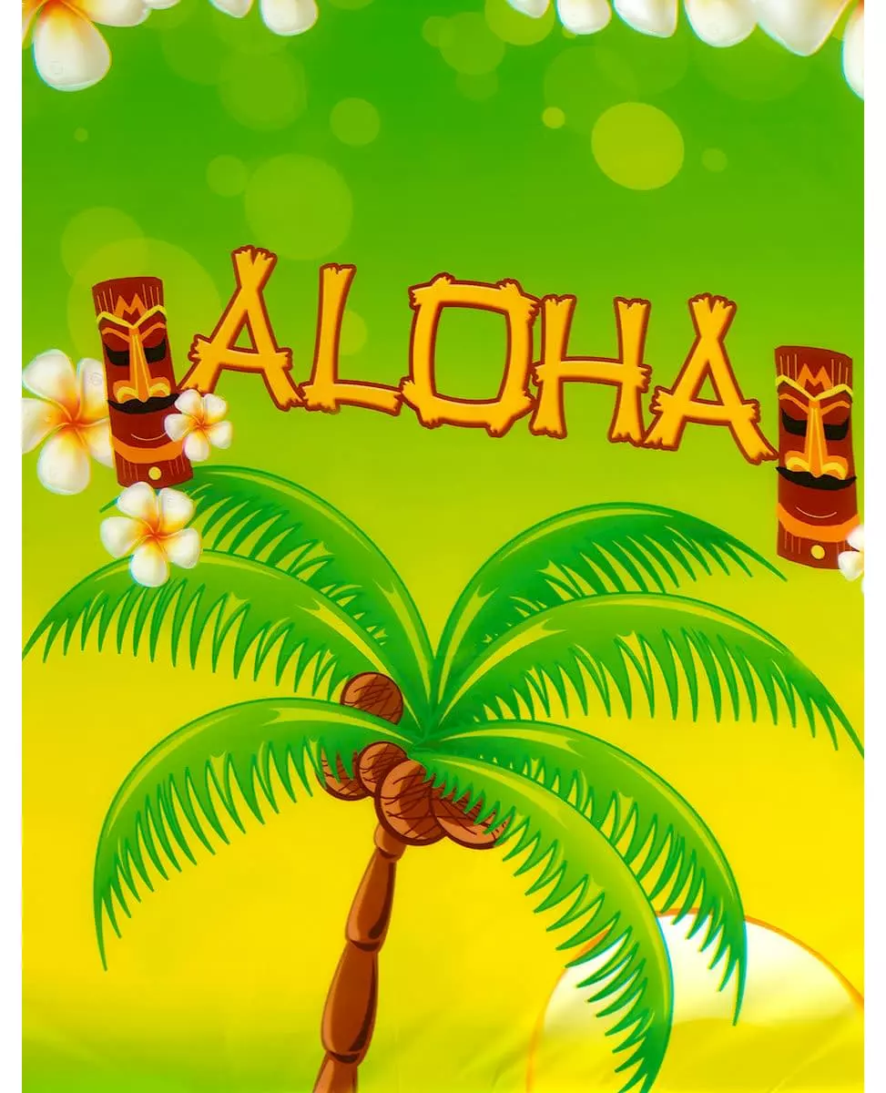 Et måltid på en tropisk øy! Denne tynne Aloha-duken i plast måler omtrent 135 cm bred og 270 cm lang. I nyanser av gult og grønt representerer den et tropisk landskap dekorert med palmer og tiareblomster. Innskriften «Aloha» er også til stede, trykt med imiterte bambusbokstaver. Denne duken vil være perfekt for å dekke et eksotisk bord til en hawaiisk kveld!. Inkludert tilbehør: Duk Materiale: Plast