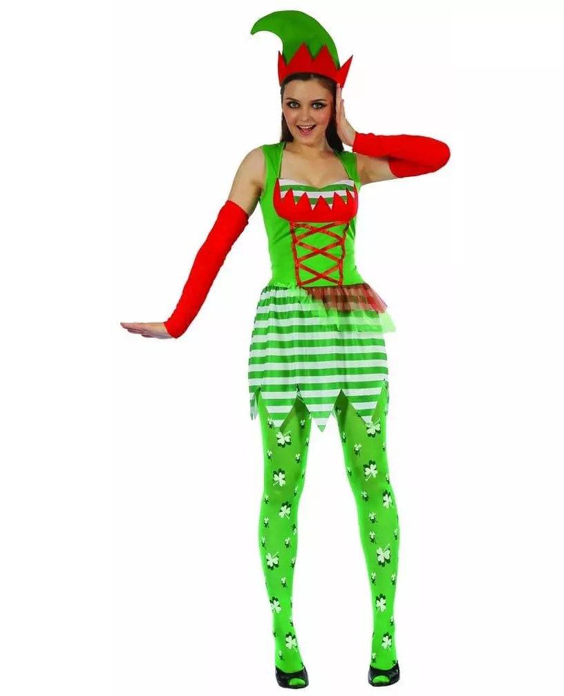 Naturens magi Dette kostymet for voksne forestiller en alv. Det inkluderer en kjole, ermer og en hatt (strømpebukser og sko er ikke inkludert). Den tettsittende kjolen er laget av grønn polyester. To stropper skaper en sexy utringning fremhevet av røde stofftupper. Røde blonder er sydd på magen, og biter av grønt og rødt slør markerer skillet mellom toppen og bunnen i livet. Kjolens underskjørt er stripete i grønt og hvitt. Bunnen er kuttet i spisser for ekstra fantasi. Polyesterermene er røde og dekker huden fra håndleddet til midten av armen. Alvehatten er typisk, kuttet i en grønn spiss. En rad med spisser kroner denne magiske hatten. Forvandle deg selv til et magisk vesen i løpet av en kveld med temaet natur eller magi. Inkludert tilbehør: Kjole 2 ermer Hatt Materiale: 100 % polyester Vedlikehold: Håndvask