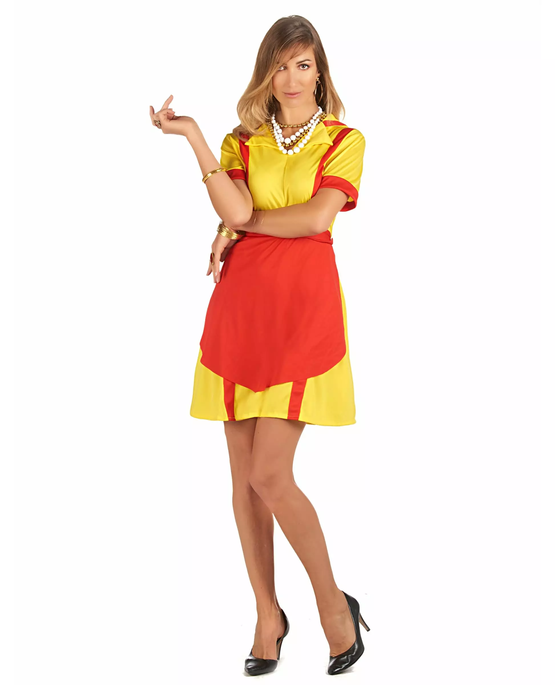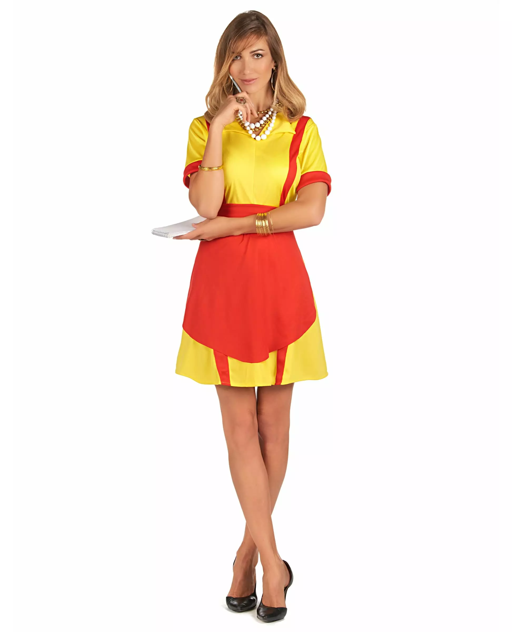 Føl deg som en servitør fra en TV-serie i denne oransje uniformen. Dette amerikanske diner-servitrisekostymet er for kvinner og inkluderer en kjole og et forkle. Kjolen er gul med to røde kanter på hver side. Mansjettene på de korte ermene er også røde. Den har et tettsittende snitt i midjen med den utsvingte skjørtdelen. Et rødt forkle går over kjolen. Det er litt avrundet og kortere enn kjolen. Et diner-servitrisekostyme fra 50-tallet som vil bli en hit på temafester med utkledning. Materiale: 100 % polyester. Inkludert tilbehør: Kjoleforkle. Stell: Håndvask.