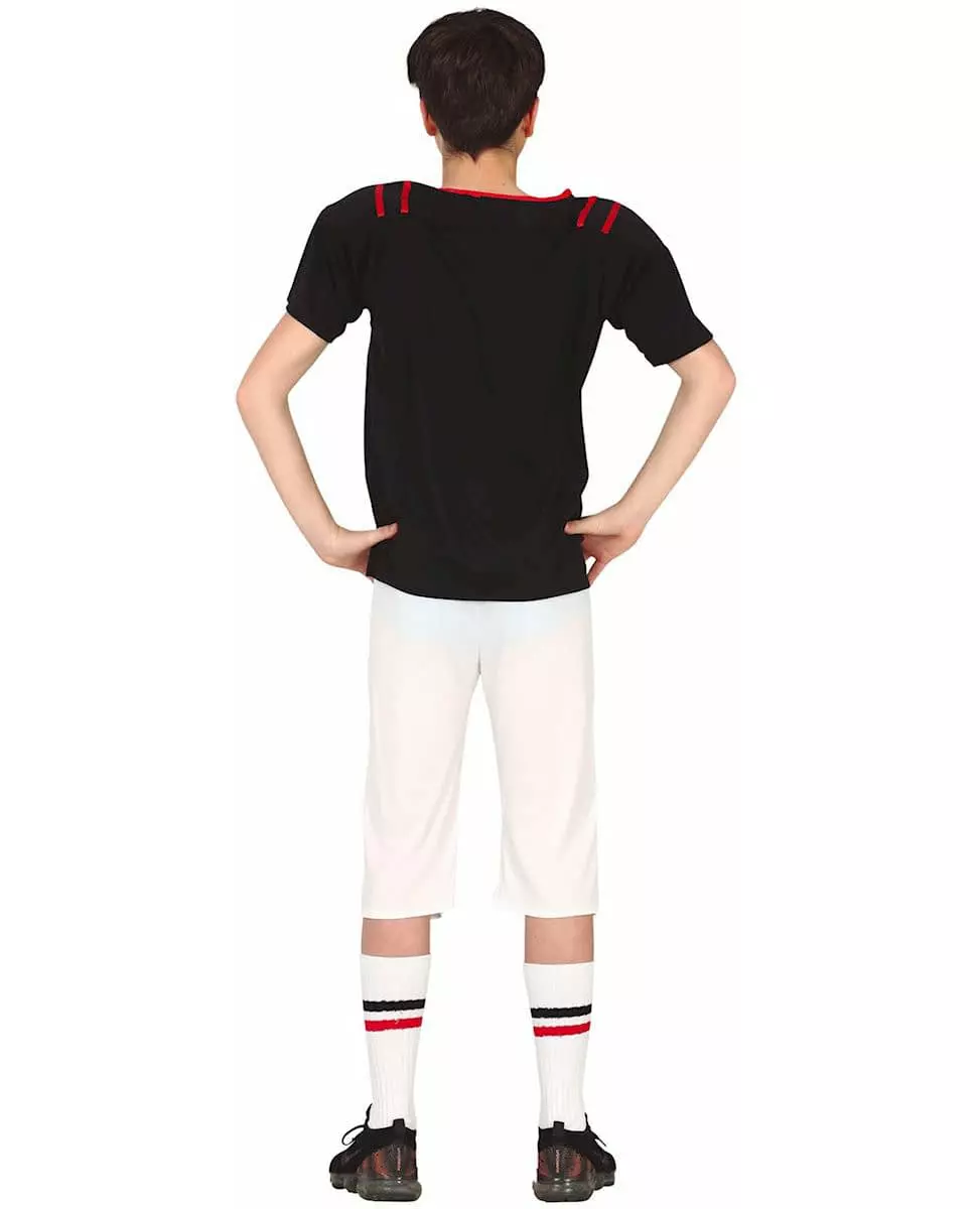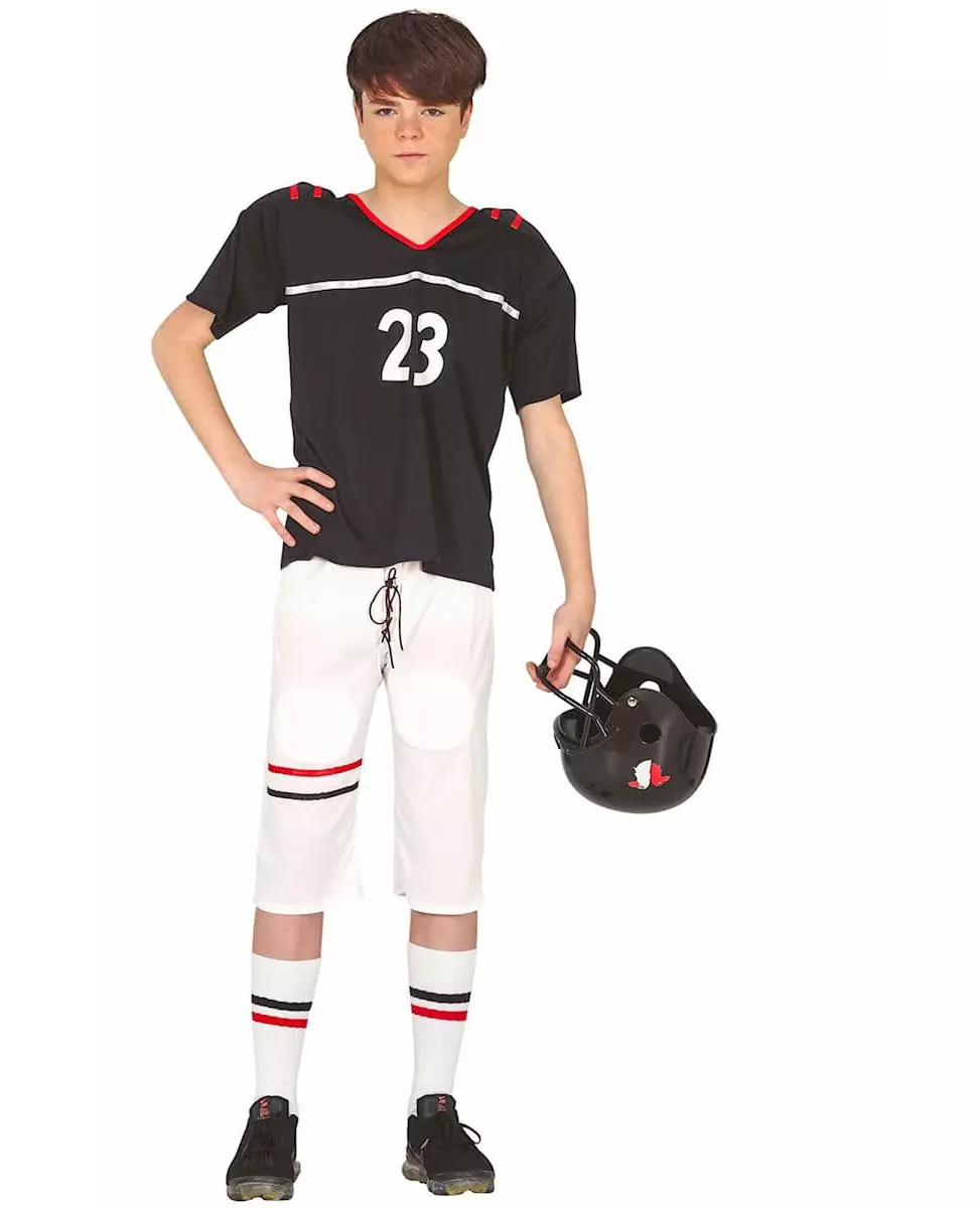 En fotballspiller med brede skuldre Dette amerikanske fotballspillerkostymet er for tenåringer. Det inkluderer en t-skjorte med skulderputer og shorts. Toppen er en svart t-skjorte med røde kanter på kragen og skuldrene. Nummeret 23 er også trykt på den. Skulderputer er tilstede i t-skjorten for å polstre toppen og gi enda mer realisme til dette amerikanske fotballspillerkostymet. De flagrende, elastiske shortsene i midjen er hvite med røde kanter og moiré-mønstre som minner om fargene på t-skjorten. Et amerikansk fotballspillerkostyme perfekt for å spille en Super Bowl-legende på en utkledningsfest eller et karneval. Materiale: 100 % POLYESTER. Inkludert tilbehør: T-skjorte med skulderputer Bukser Stell: Ikke maskinvask eller stryk