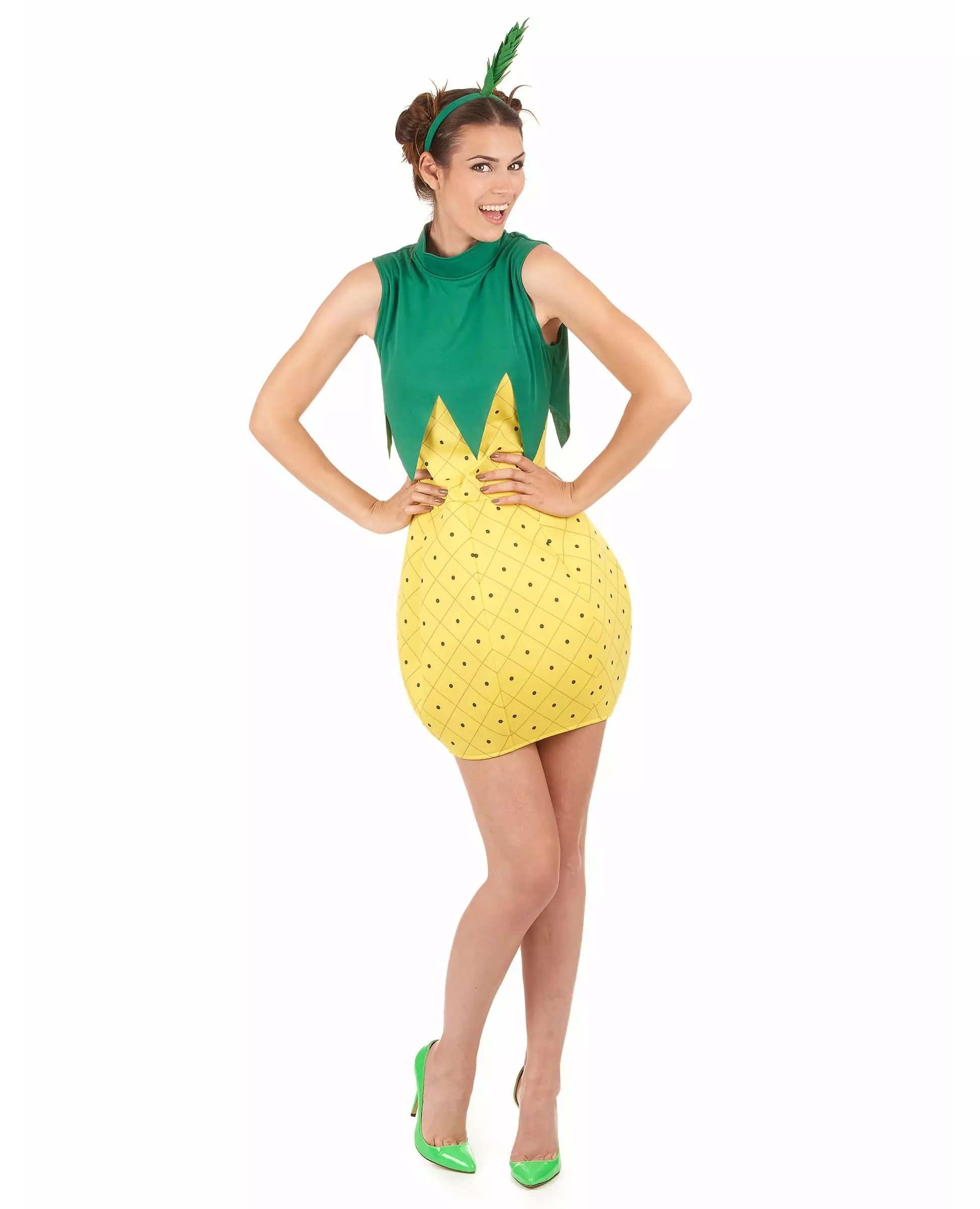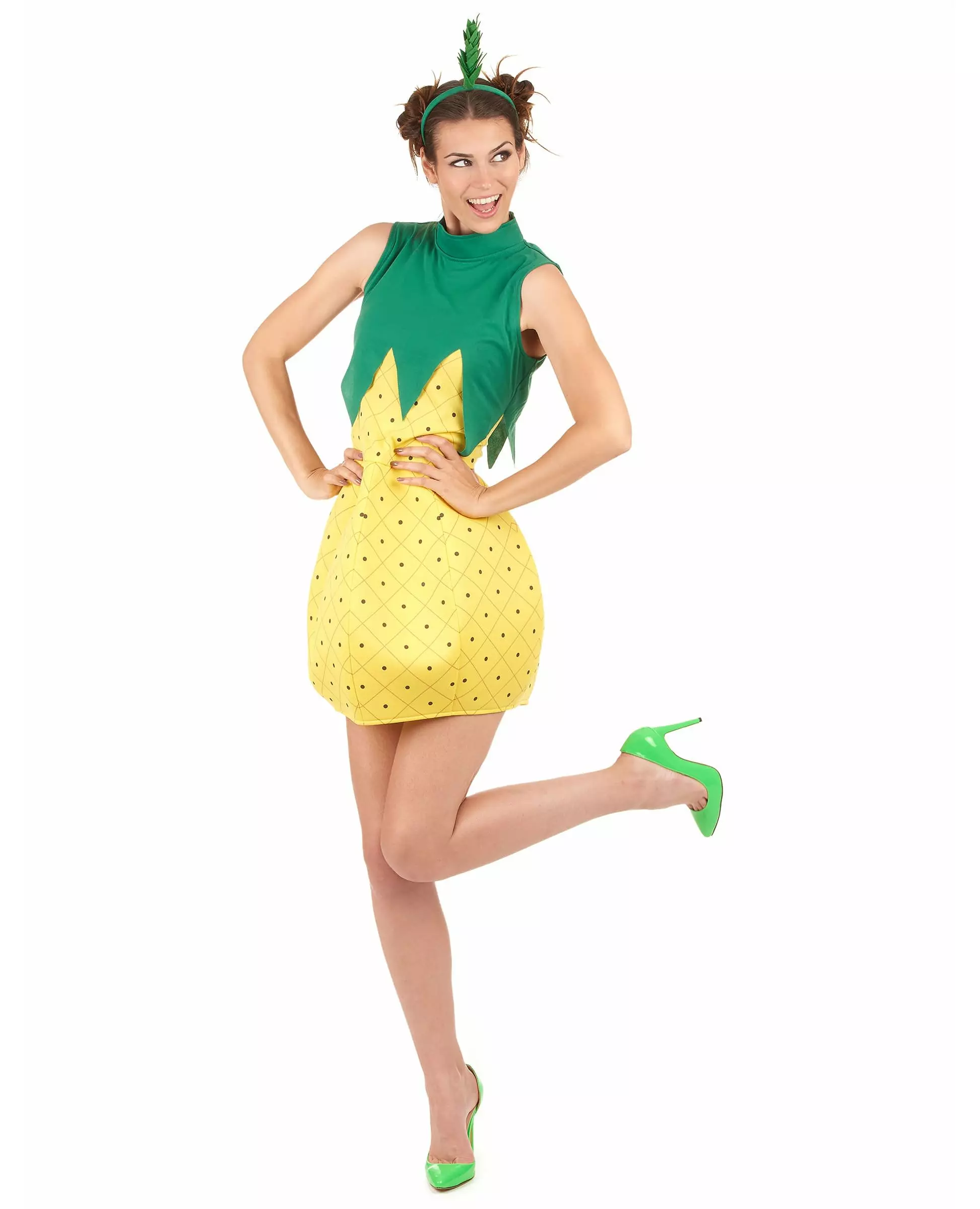 Fruktsalat! Dette fantastiske ananaskostymet er for kvinner og inkluderer en kjole og et pannebånd (sko ikke inkludert). Kjolen har tydelig form som en ananas, med den øvre delen kuttet i spisser som fremkaller grønne blader, og den nedre delen laget av mykt skum formet som en ball som underside av frukten. Kjolen er ermeløs med rund hals. Antrekket lukkes med glidelås bak. Pannebåndet er grønt og toppet med en grønn filtstilk, og det fullfører antrekket perfekt. For en sommerkveld i forkledning eller til karneval, vil denne kjolen garantert være originaliteten til ditt øyeblikk mellom venner! Inkludert tilbehør: Pannebånd til kjolen Materiale: Polyester Stell: Håndvaskbar