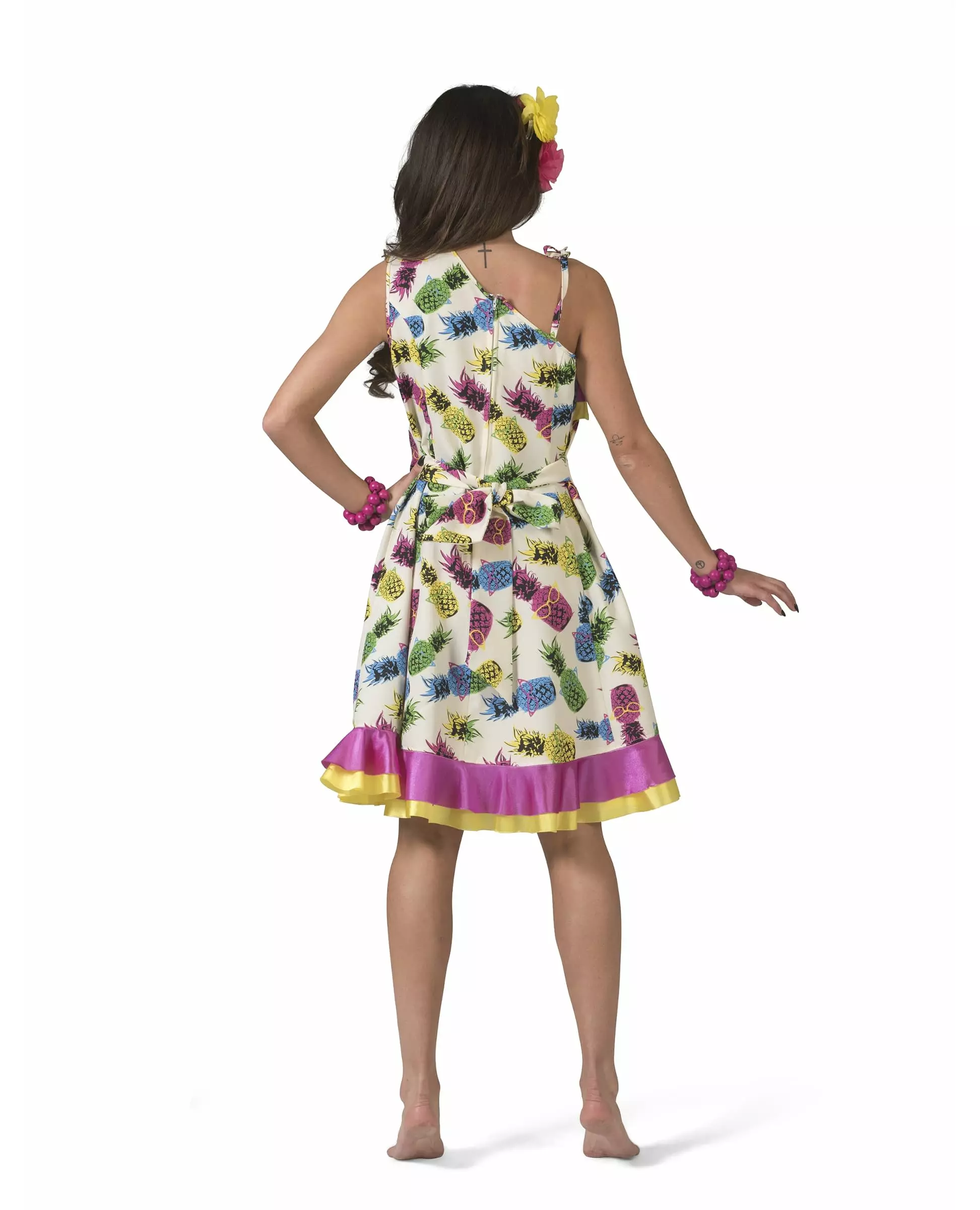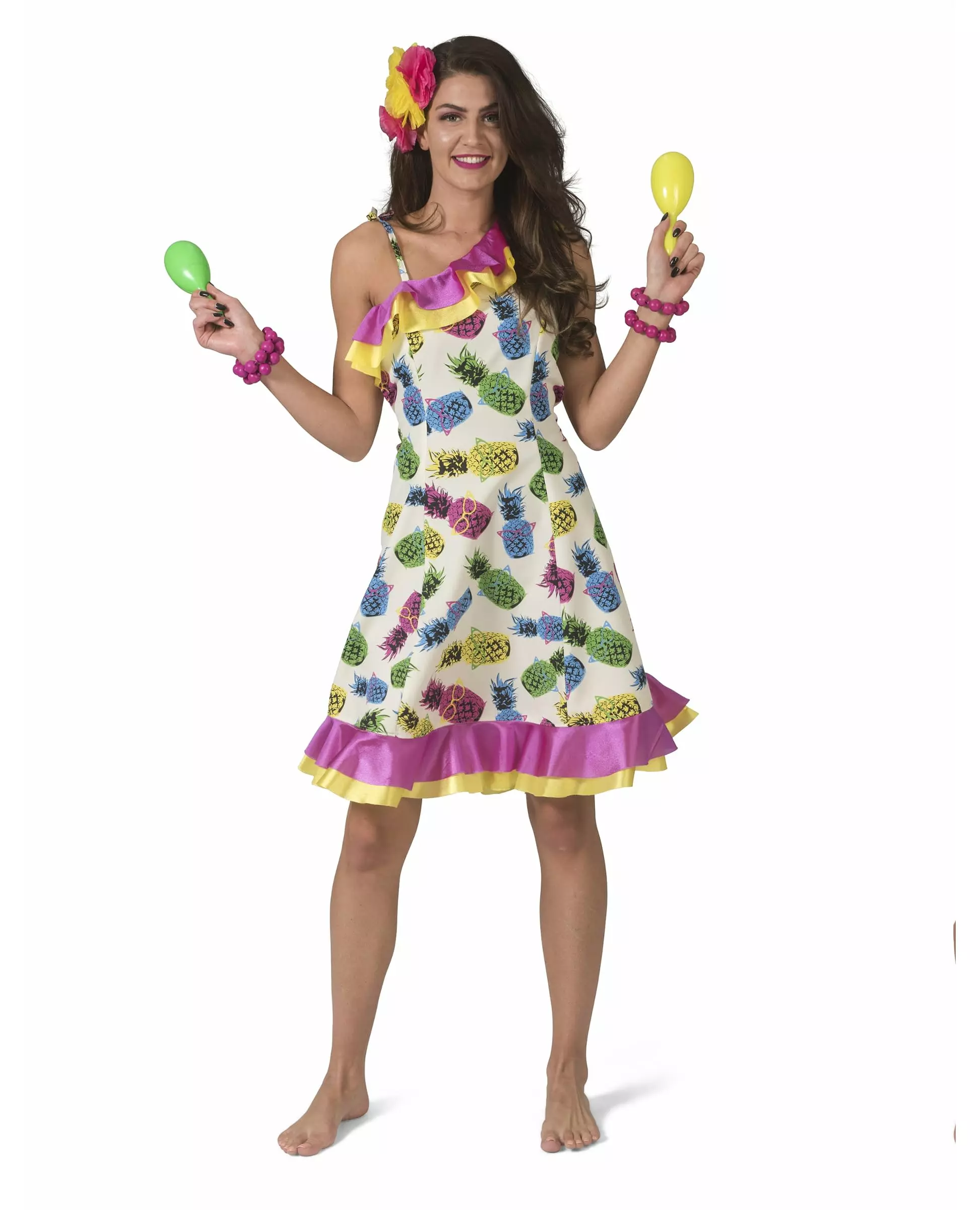 Litt rumba på stranden? Dette rumbadanserkostymet for kvinner består av en kjole som selges separat. Kjolen har en asymmetrisk krage. Rosa og gule satengryss fremhever kragen og bunnen av kjolen. Den er laget av et hvitt stoff med rosa, blå, gule og grønne ananasmønstre. Dette kostymet vil være perfekt for en rumba- eller hawaiisk fest. Inkludert tilbehør: Kjole Materiale: 100 % polyester Vedlikehold: Håndvask