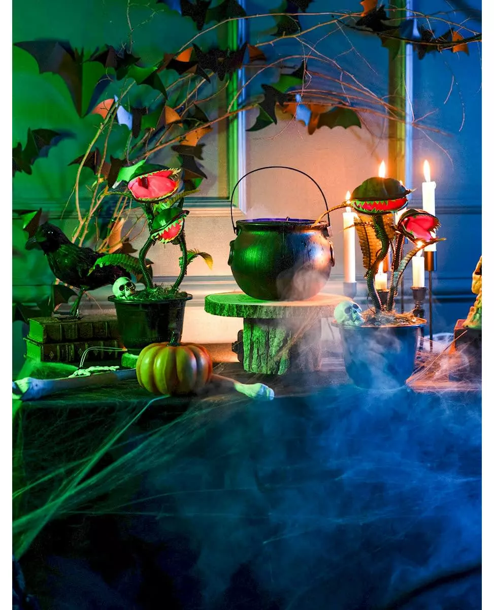 Se opp for den kjøttetende planten! Denne animerte kjøttetende planten måler omtrent 42 cm. Dekorasjonen har en potte der to kjøttetende planter i forskjellige størrelser er plantet. Bare slå på dekorasjonen for å animere den kjøttetende planten og starte litt skrekkfilmmusikk. Plantene har et lite rødt lys inni de store munnene sine. Denne kjøttetende planten vil være perfekt for å dekorere Halloween-bordet ditt!. Inkludert tilbehør: 1 dekorasjon
