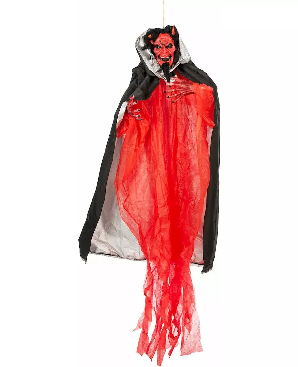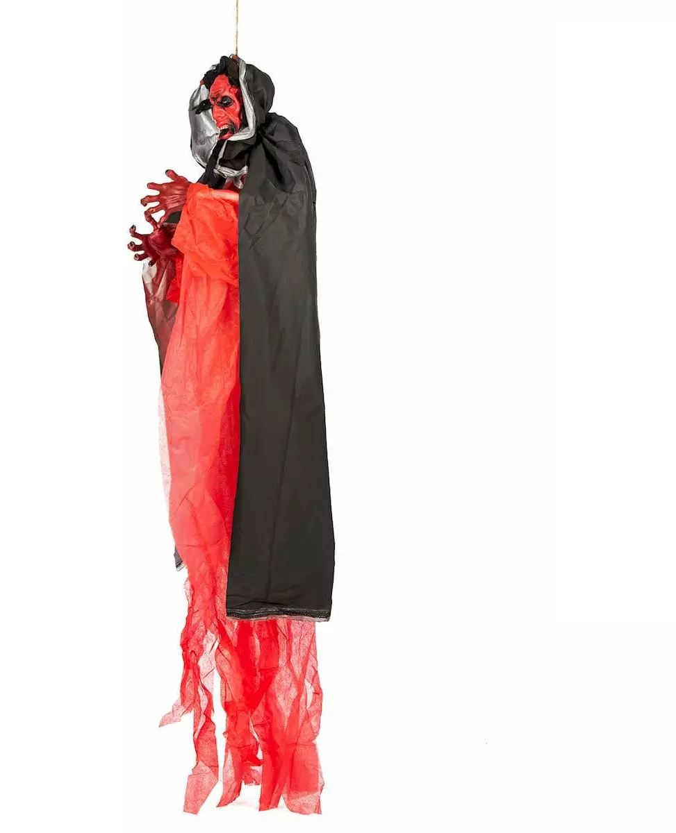 Inviter demonene inn i hjemmet ditt til Halloween. Denne animerte og lysende dekorasjonen forestiller en demon. Den er kledd i rødt og har et demonhode med horn og en svart geiteskjegg. Denne dekorasjonen måler omtrent 190 cm i lengden. Øynene er lysende og blir røde når de slås på. Den fungerer med 3 LR44-batterier. Den vil være perfekt for å dekorere hjemmet ditt på Halloween-kvelden. Inkludert tilbehør: Oppheng. Materiale: Plast og polyester.