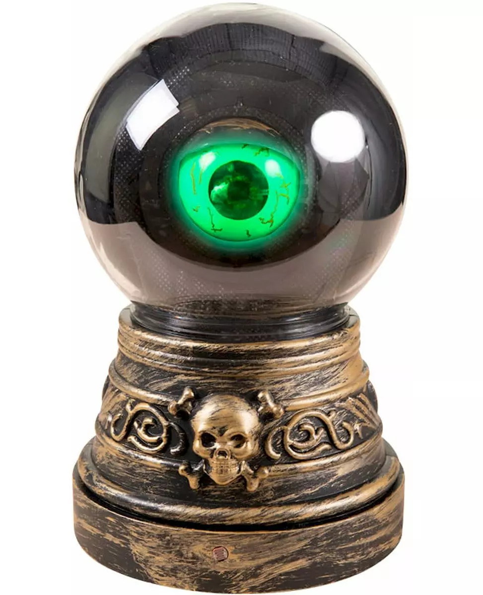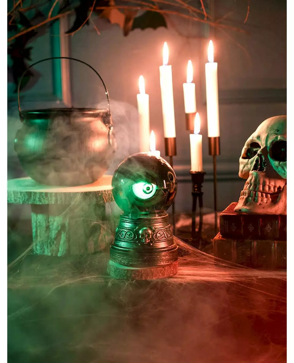 En skremmende øyekule! Denne dekorasjonen forestiller en krystallkule med et animert øye. Den måler omtrent 20 cm. Denne kulen har lyd og lys. Når den aktiveres, åpnes et grønt øye og beveger seg fra høyre til venstre. Denne krystallkulen vil være perfekt for å vekke ånder på Halloween-kvelden! Inkludert tilbehør: 1 animert øyekule Materiale: Plast Vedlikehold: Ikke vask