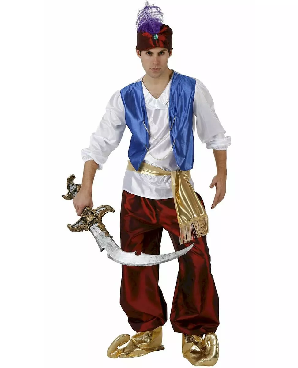 Komplett kostyme! Dette arabiske prinskostymet for menn består av en langermet t-skjorte, bukser, en hatt, et belte og et par skoovertrekk (fjær ikke inkludert). Den hvite toppen med integrert blå vest har to gullkjeder foran og borrelås på baksiden for enkel bruk. De mørkerøde buksene med skinnende effekt har elastikk i midjen og anklene for en puffy effekt. Antrekket kompletteres av en hatt med en grønn stein foran og et gullbelte og skoovertrekk. Dette antrekket vil være ideelt for å sette deg inn i en arabisk prins' sko under utkledningsfestene dine. Inkludert tilbehør: Bukser T-skjorte Hatt Belte Skoovertrekk Materiale: 100 % polyester Vedlikehold: Håndvask