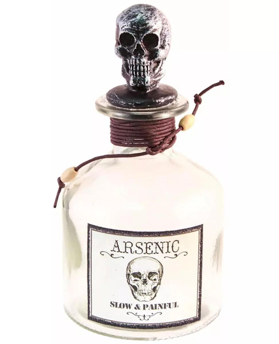 Arsenikk til Halloween! Denne arsenikkflasken måler omtrent 16 cm. Den er hvit og har en etikett med påskriften «Arsenikk, langsom og smertefull» dekorert med en hodeskalle. Den er dekorert med en brun snor, og korken forestiller en skjeletthodeskalle. Plasser denne arsenikkflasken på Halloween-bordet ditt og se hvem som tør å røre den! Inkludert tilbehør: 1 flaske