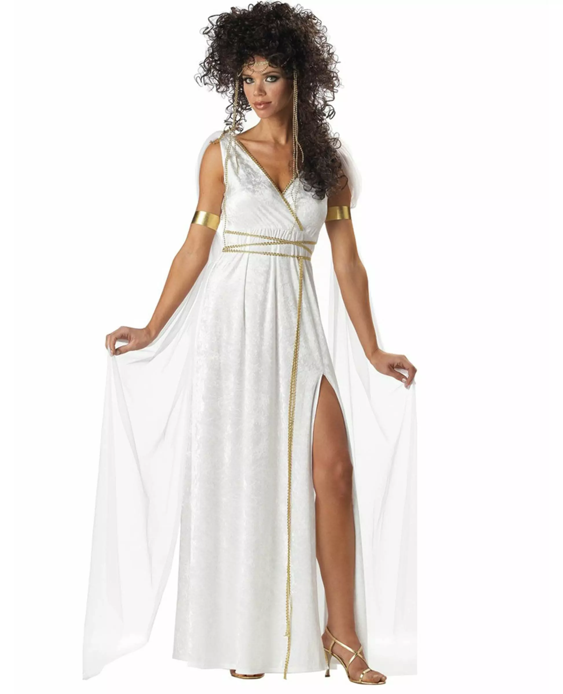 Forvandle deg til en gresk gudinne! Dette greske kostymet for voksne består av en kjole og et hodeplagg (sko ikke inkludert). Den lange hvite kjolen, med splitt på siden, er laget av et materiale med fløyelseffekt. Halsutringningen er dekorert med gullflette. Et langt gullbånd til å vikle rundt livet er sydd fast på kjolen. To strimler av hvitt slør med armløkker er sydd på skuldrene. Hodeplagget er et gullbånd med rader med perler på. Dette kostymet vil være perfekt for å forvandle deg til en gresk gudinne, for en kveld i antikkens Hellas eller til et kostymefest. Inkludert tilbehør: Kjole med slør Hodeplagg Materiale: 100 % polyester Stell: For hånd