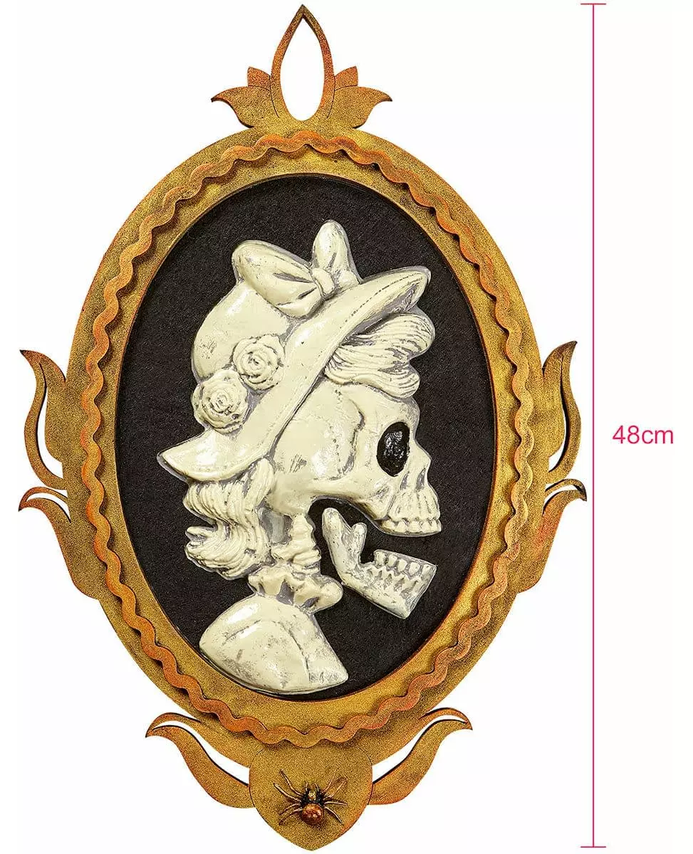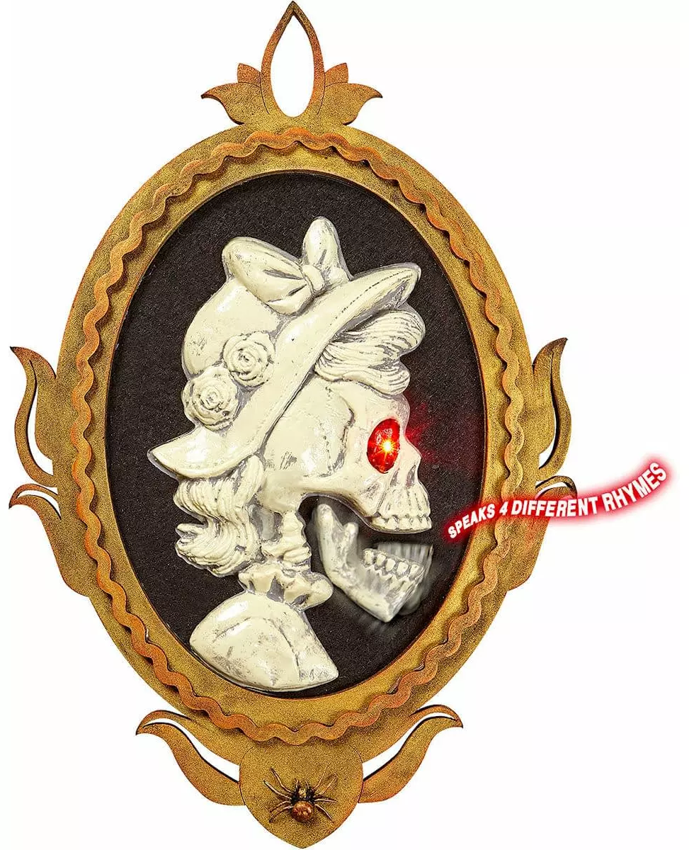 Denne Halloween-dekorasjonen kan du lage en ekte spøkelseshusdekorasjon! Denne dekorative rammen måler omtrent 32 x 48 cm. Den forestiller en skjelettdame i profil på svart bakgrunn, i en ramme med gulltoner. Skjelettets øye lyser rødt og aktiveres av en bevegelsesdetektor. Skjelettdamen resiterer fire forskjellige barnerim på engelsk og beveger kjeven samtidig. Denne rammen bruker tre AAA-batterier. Den vil være perfekt for å fullføre dekorasjonen din på Halloween-kvelden. Inkludert tilbehør: 1 ramme