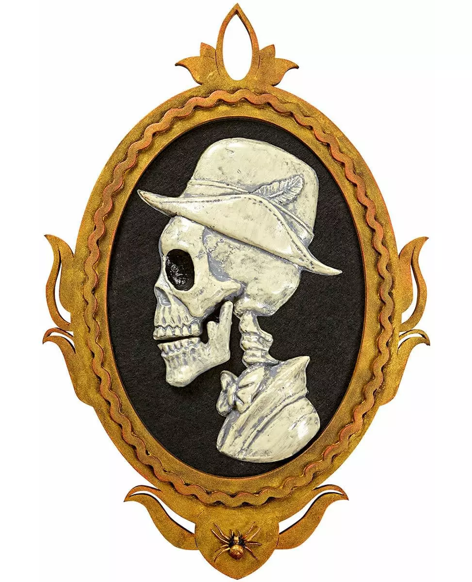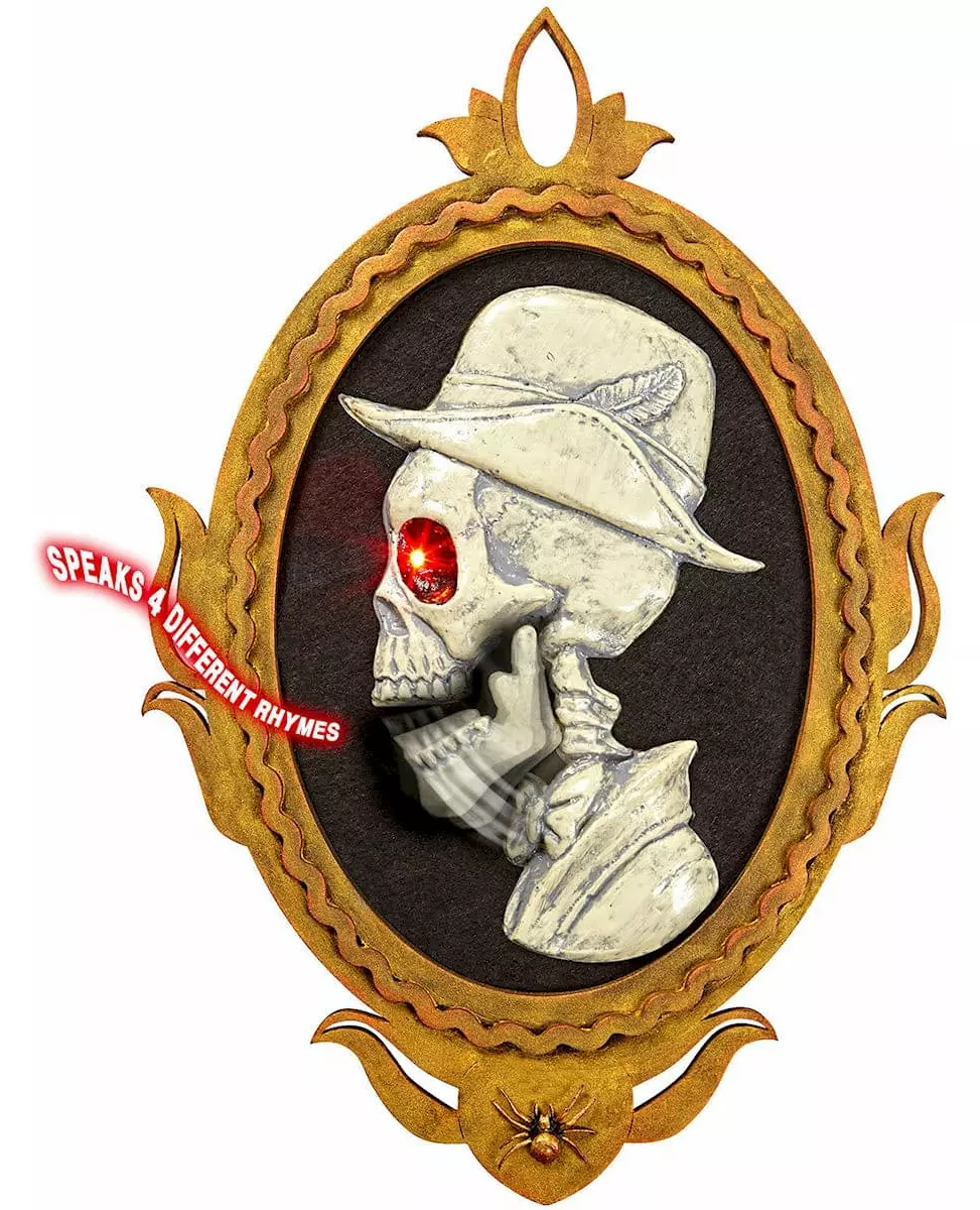 Til Halloween, velg en dekorasjon i hjemsøkt hus-stil! Denne dekorative rammen måler omtrent 32 x 48 cm. Den representerer en elegant ramme med et portrett av et skjelett i profil i midten. Denne rammen er animert. Øyet lyser rødt, og munnen åpnes mens skjelettet snakker. Den resiterer fire forskjellige barnerim på engelsk. Den fungerer med tre AAA-batterier. Den vil være perfekt for å fullføre din hjemsøkte hus-tema-dekorasjon på Halloween-kvelden. Inkludert tilbehør: 1 ramme
