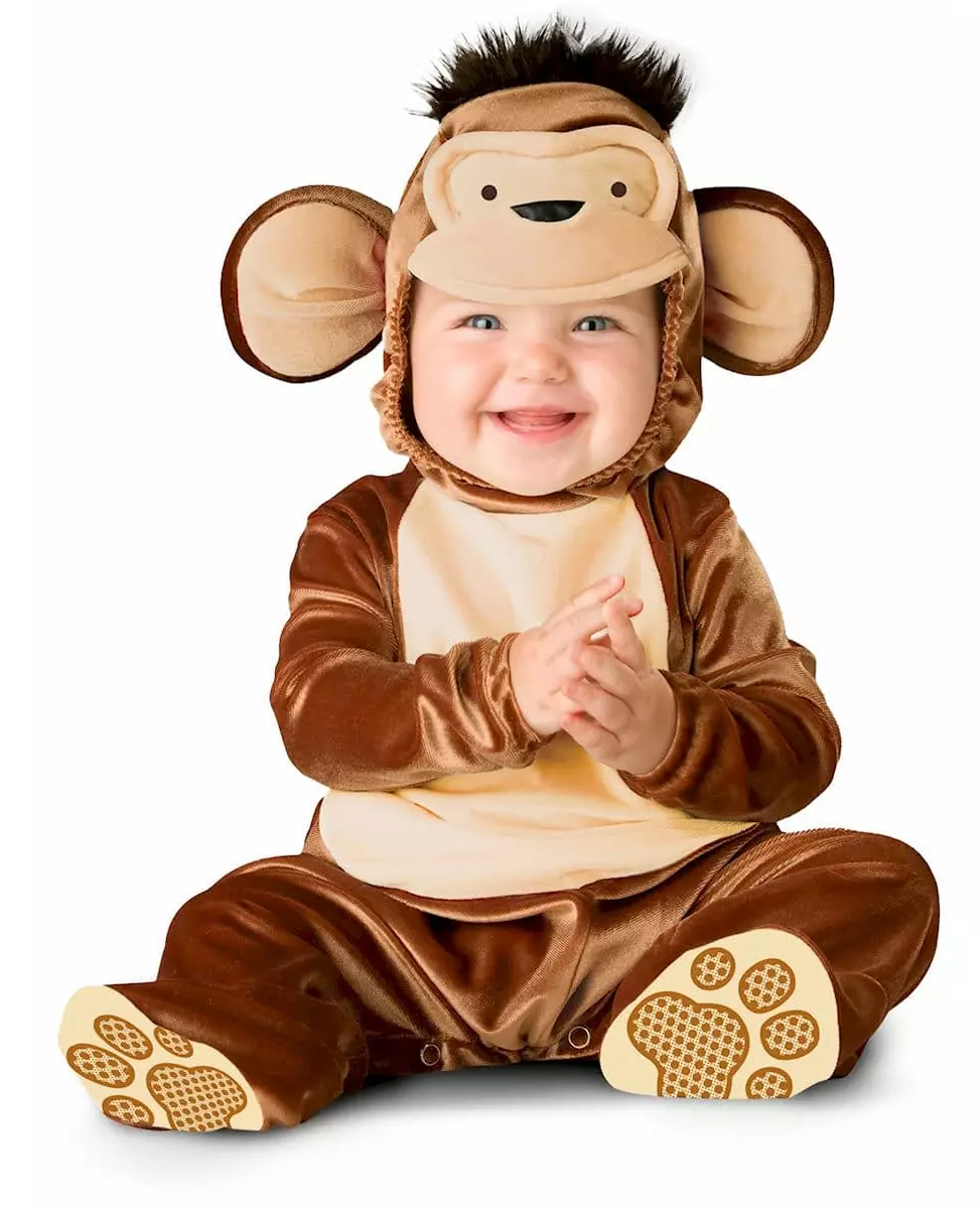 Få tilgivelse for alle dine påfunn! Dette babyapekostymet i fløyelseffekt består av en jumpsuit og en hette. Jumpsuiten har brun fløyelseffekt over hele verket, deretter beige på den sentrale delen, lukkes med borrelås bak samt trykknapper i skrittet. Den har små sklisikre puter under føttene. Hetten forestiller et apehode med to ører lukkes under haken med borrelås. Få alle dine påfunn tilgitt med dette søte apekostymet. Inkludert tilbehør: Jumpsuit Hette Materiale: 100 % polyester Stell: Håndvask Målinformasjon: For størrelse 6/12 måneder er jumpsuiten omtrent 69 cm lang. For størrelse 18/24 måneder er jumpsuiten omtrent 80 cm lang.