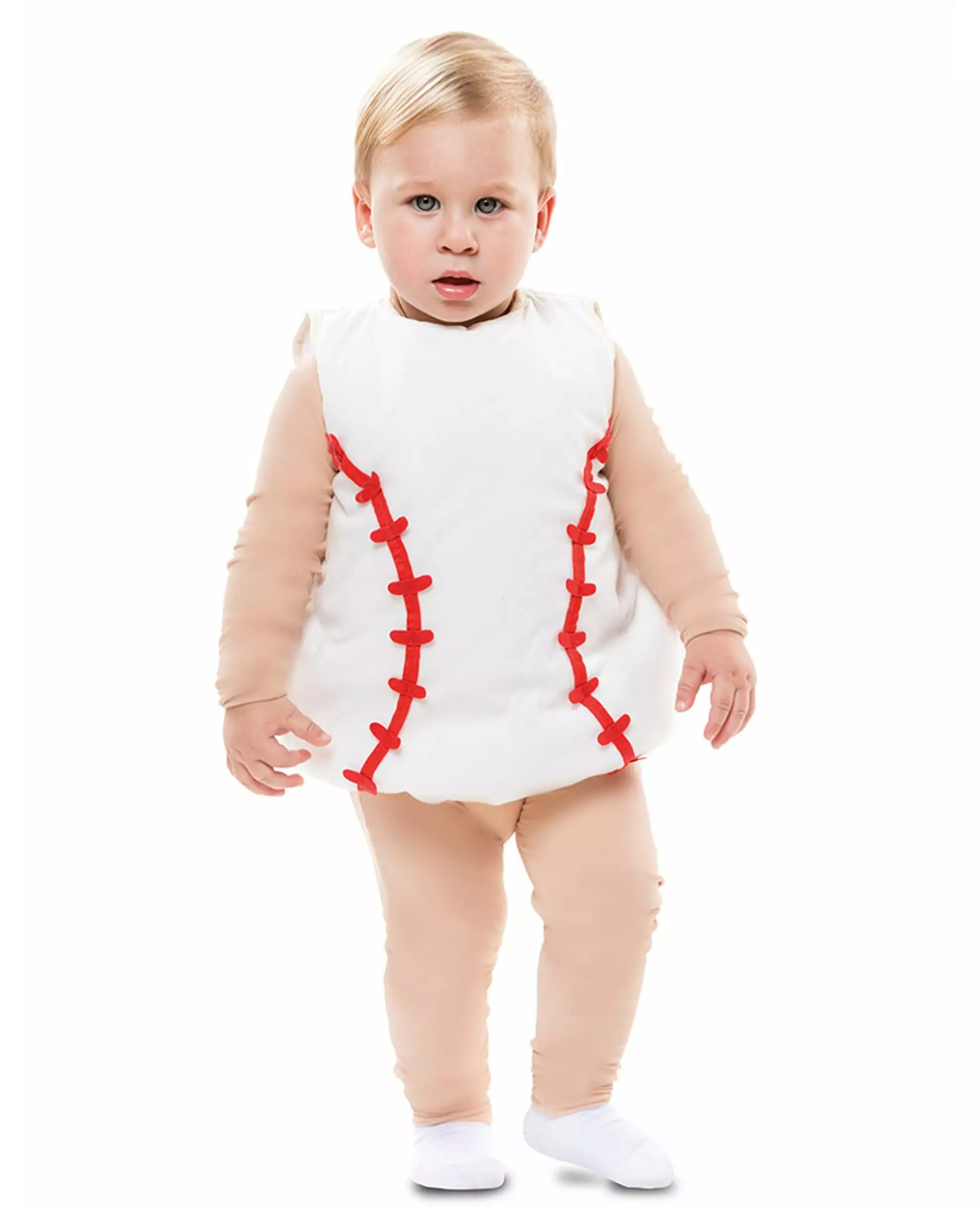 Home Run! Dette baseballkostymet til babyer består av en tunika (beige tunika ikke inkludert). Tunikaen er laget av hvitt stoff med røde sømmer som på baseballer. Denne avrundede tunikaen er polstret for å bevare formen. Dette baseballkostymet vil være perfekt for en sports- eller amerikansk-temafest. Inkludert tilbehør: Tunika Materiale: 100 % polyester Vedlikehold: Håndvask