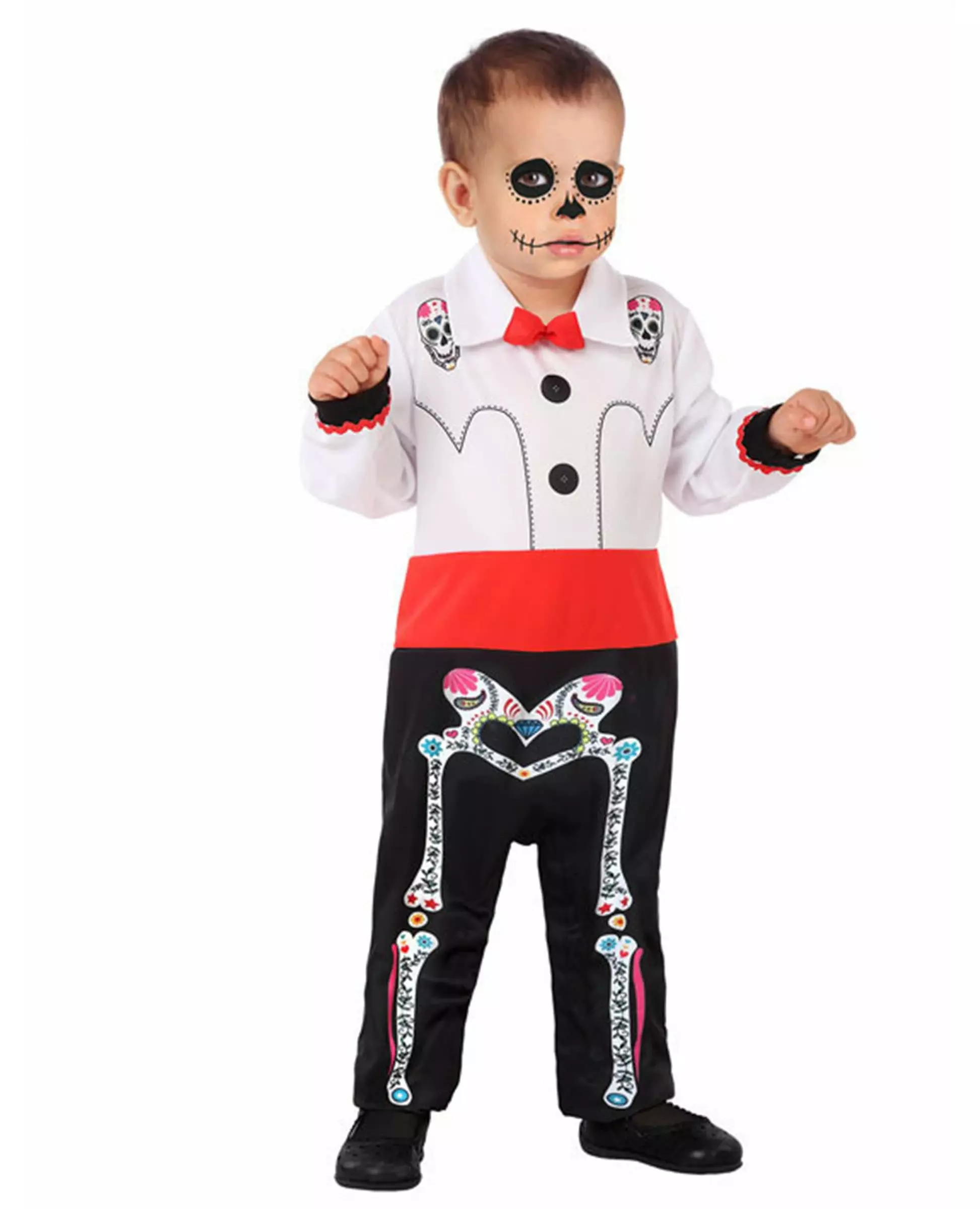 Det ideelle kostymet for babyer på Halloween-kvelden. Dette Dia de los Muertos-kostymet for babyer består av en jumpsuit (sminke og sko er ikke inkludert). Toppen av jumpsuiten er hvit for å imitere en skjorte. På toppen er det meksikanske hodeskallemønstre. Midjen er ensfarget rød. Nederdelen av jumpsuiten er svart med fargerike skjelettmønstre. Dette kostymet vil være perfekt for å ta med babyen for å feire Halloween ved din side. Inkludert tilbehør: Jumpsuit Materiale: 100 % polyester Pleie: Håndvask