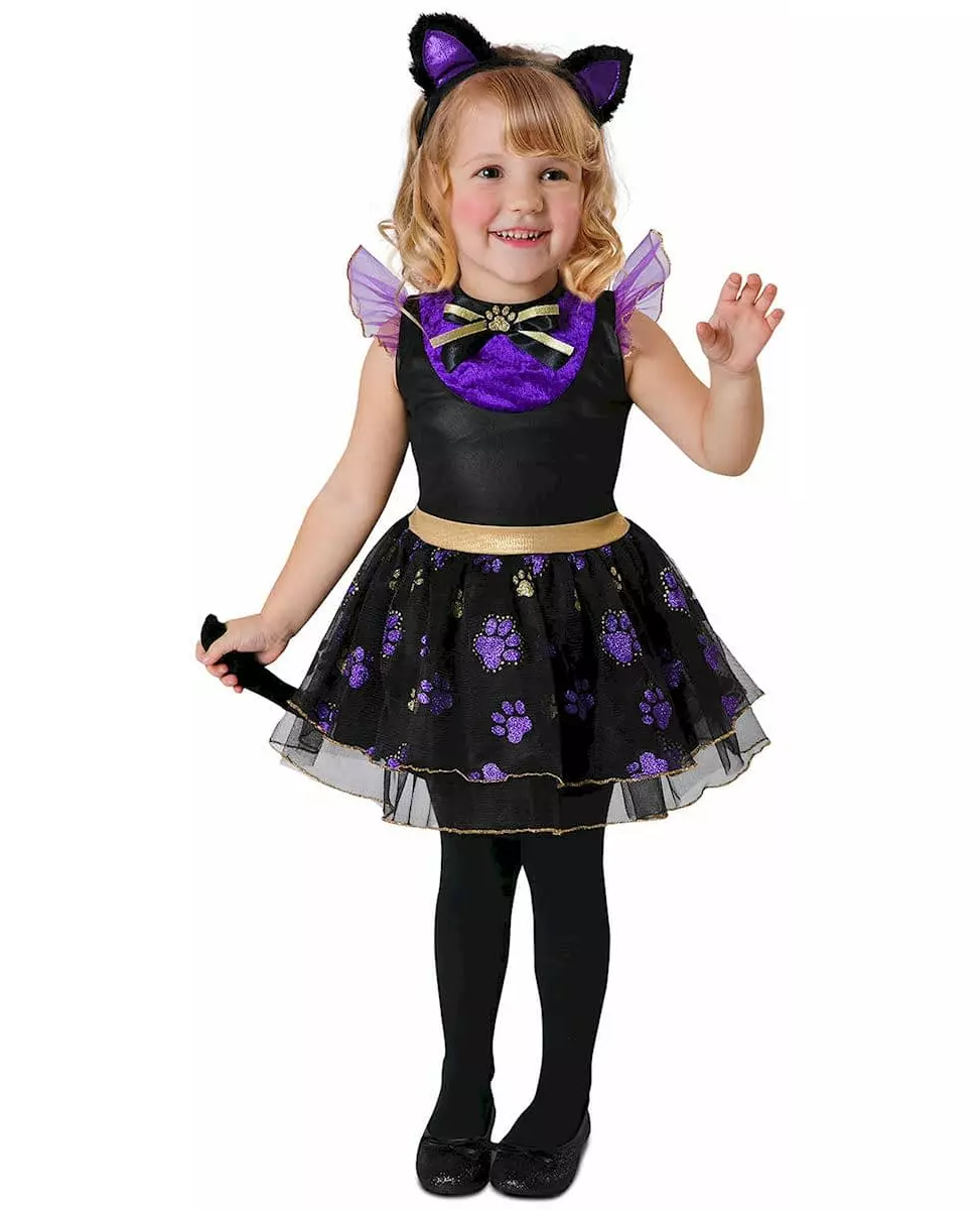 Til Halloween har vi også rett til å bruke et søtt kostyme! Dette lille kattekostymet for babyer består av en kjole, en hale og et pannebånd (strømpebukser og sko er ikke inkludert). Den korte kjolen er svart, med lilla rysjer ved ermhullene. Halsutringningen er også laget av lilla stoff, med en svart og gullfarget sløyfe. Nederdelen av kjolen er laget av svarte slørrysjer. Over er det kattepoteavtrykk i lilla og gull. En kattehale er plassert på ryggen. Den er ensfarget svart. Til slutt setter et pannebånd prikken over i-en til dette kostymet. Det er dekorert med svarte og lilla katteører. Dette kostymet vil gjøre datteren din til den søteste lille katten til Halloween. Inkludert tilbehør: Kjolehalepannebånd Materiale: 100 % polyester Stell: Håndvask