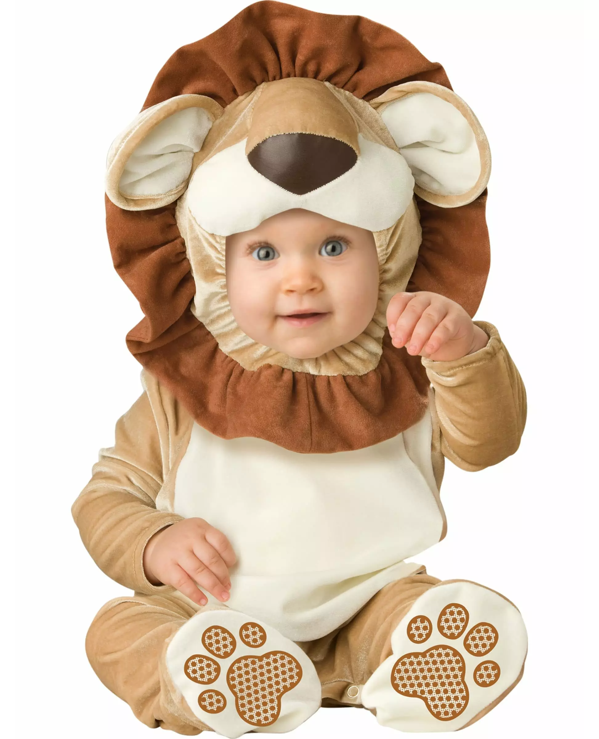 Bli den lille kongen på kostymefesten! Dette løvekostymet for babyer består av en jumpsuit og en hette. Jumpsuiten har trykknapplukking på beina for å gjøre det enklere å skifte bleie. Den har en fløyelseffekt og er veldig lys brun med en kremfarget mage. Det er sklisikre poteavtrykk under føttene. Det er en borrelåslukking på baksiden av jumpsuiten for å gjøre den enkel å ta på. Hetten representerer løvens hode med brun man. Den lukkes under haken med en borrelåslukking. Med dette løvekostymet vil babyen din være kveldens søteste. Inkludert tilbehør: Jumpsuit Hette Materiale: 100 % polyester Stell: Håndvask