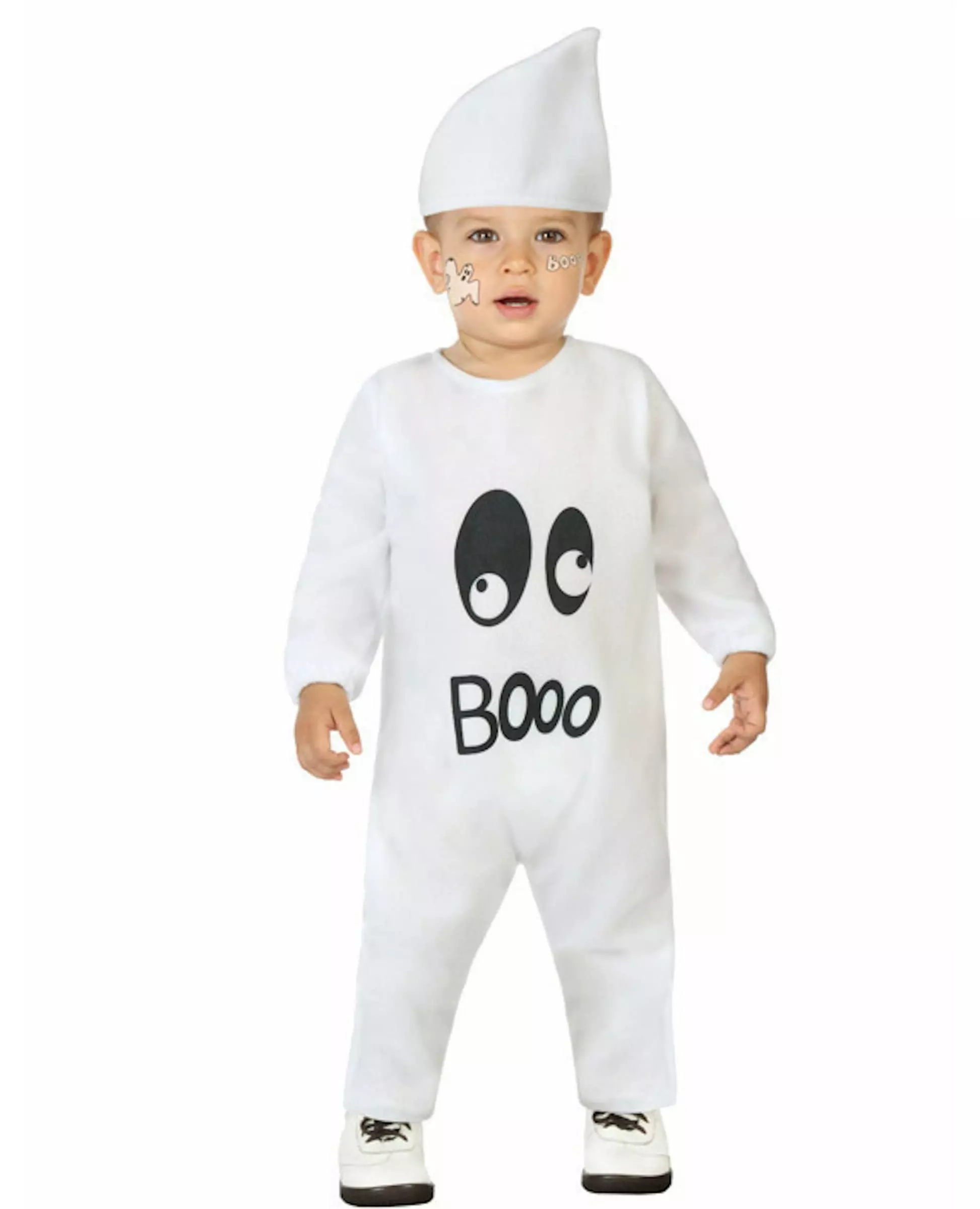 Tenk på et babykostyme til Halloween! Dette spøkelseskostymet for babyer består av en jumpsuit og en hatt. Jumpsuiten er hvit, med ville øyne og ordet «Booo» på forsiden. Hatten er også ensfarget hvit, og har en spiss på siden. Dette søte kostymet vil være perfekt for å forkle den lille på Halloween-kvelden. Inkludert tilbehør: Jumpsuit-hatt Materiale: 100 % polyester Stell: Håndvask