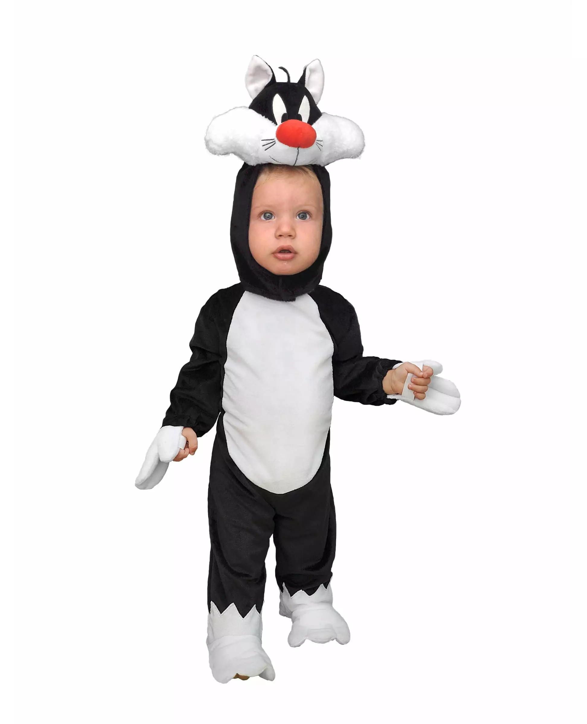 En Sylvester leter etter Tweety! Dette Sylvester™ Tweety™ og Sylvester™-kostymet for babyer er offisielt lisensiert av Warner Bros™. Det består av en jumpsuit med glidelås og et hodeplagg. Jumpsuiten er svart over det hele, deretter hvit i endene og på magen. Den kjennetegnes av det myke, korthårede stoffet. Den vil derfor være veldig komfortabel for barnet ditt. Den har lange ermer med falske katteklør på håndleddene. Nederdelen av jumpsuiten kjennetegnes av hvite falske katteføtter. Akkurat som hendene kan barnet ditt enkelt holde endene med en hvit strikk. Til slutt er hodeplagget en hette som representerer Sylvesters hode med store øyne og rød snute. Hetten lar ansiktet være fritt og lukkes under haken med borrelås. Dette Sylvester-kostymet vil være den perfekte muligheten for barnet ditt til å gjøre et plask på karnevalet eller på en bursdagsfest! Inkludert tilbehør: Jumpsuit Hodeplagg Materiale: 100 % polyester Stell: Håndvask