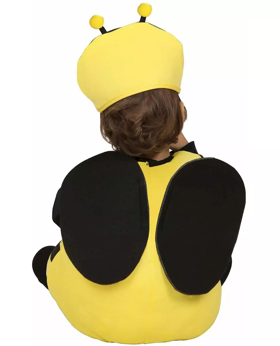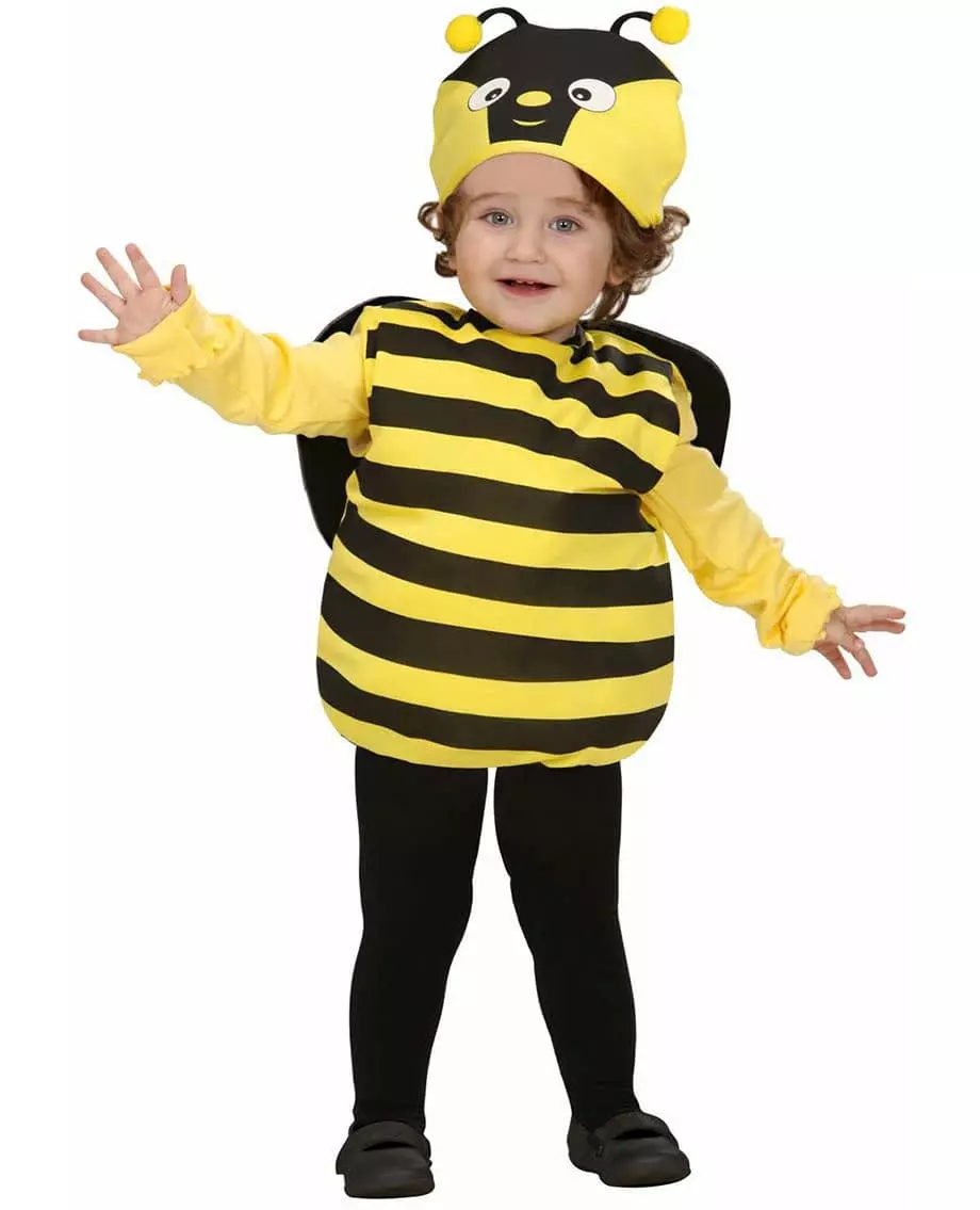 Realistisk! Dette biekostymet for barn består av en jumpsuit og en hatt (t-skjorte, strømpebukser, sko ikke inkludert). Jumpsuiten er gul og svart stripete med svarte vinger sydd på ryggen. Den er polstret med skum og lukkes med borrelås på ryggen. Den måler omtrent 39 cm i lengden. Hatten er svart og gul med antenner med gule pomponger. Dette kostymet vil være perfekt for karneval eller et arrangement. ©Copyright Widmann SRL. Inkludert tilbehør: jumpsuithatt Materiale: 100 % polyester Vedlikehold: Håndvask