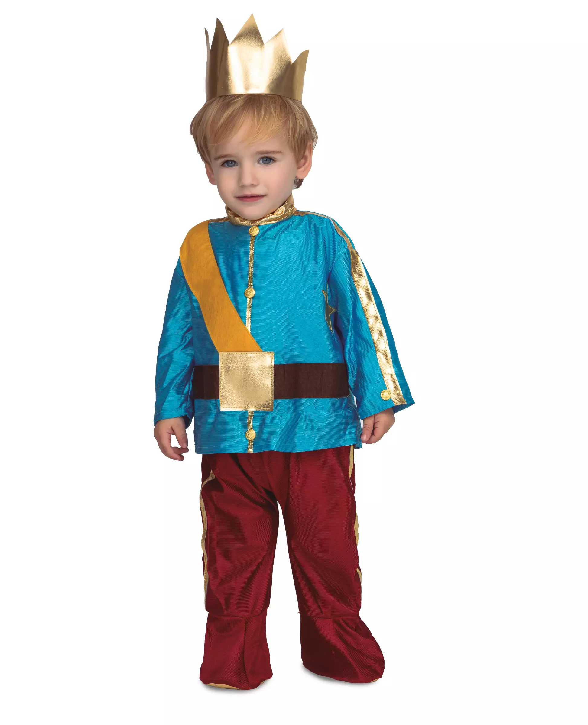Besteg tronen i dette blå prinsekostymet med krone for babyer! Dette blå prinsekostymet med krone er for babyer. Det inkluderer jumpsuit og krone. Toppen er blå og har gulldetaljer på ermene og kragen! Små gullknapper lukker denne tunikaen. Et falskt gult skjerf, et brunt belte og en gullspenne er sydd fast på kostymet. Buksene er røde med gullsøm. Alt som mangler er kronen som skal settes på hodet for å se ut som en liten konge! Dette kostymet vil være perfekt for karneval eller en kostymefest! Gjør plass til Hans Høyhet! Inkludert tilbehør: Kronejumpsuit Materiale: 100 % polyester Stell: Håndvask