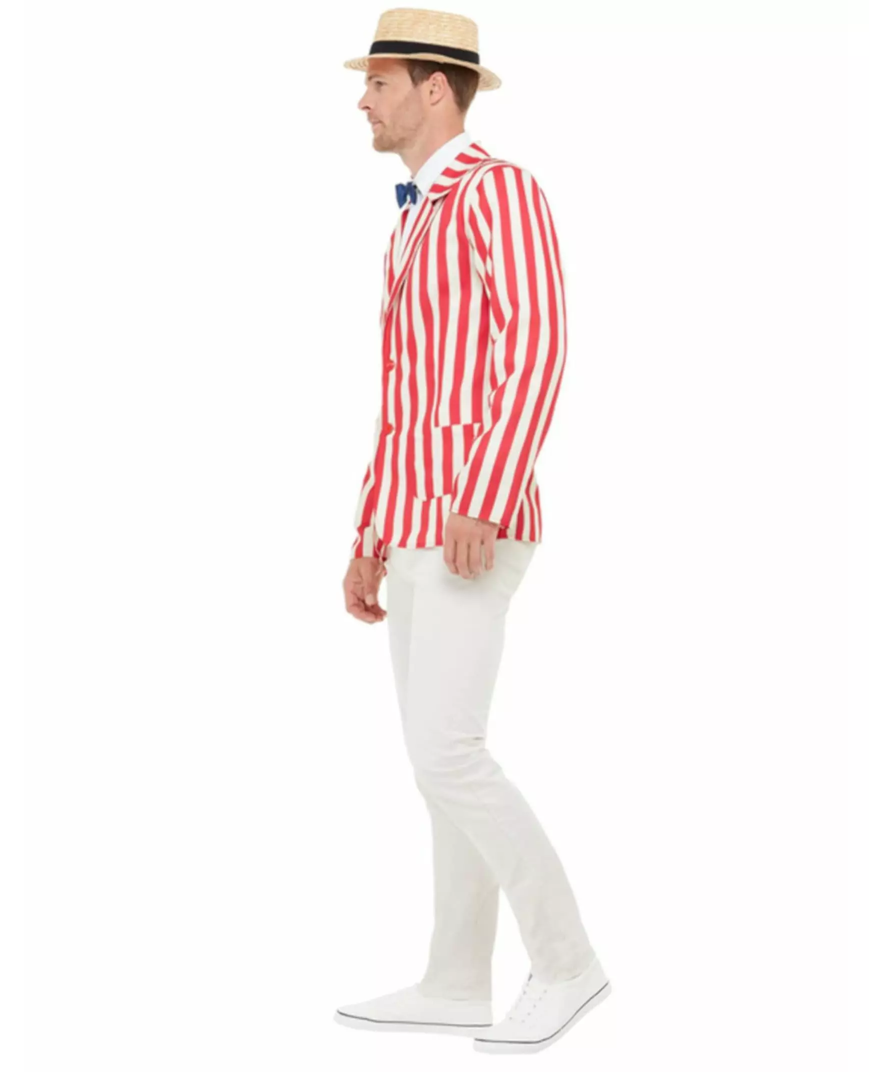 Det perfekte kostymet for å gi deg 20-tallsmoten Dette barberkostymet for menn fra 20-tallet består av en jakke, en hatt og en sløyfe (skjorte, bukser og sko er ikke inkludert). Jakken er rød- og hvitstripete. Den har sidelommer og lukkes med røde knapper foran. Hatten er laget av lyst strå med et mørkeblått bånd nederst. Til slutt fullfører en liten blå sløyfe kostymet. Dette kostymet vil være perfekt for å gi deg 20-tallsmoten til karnevalet. Inkludert tilbehør: Jakke, hatt, sløyfe. Materiale: 100 % polyester.