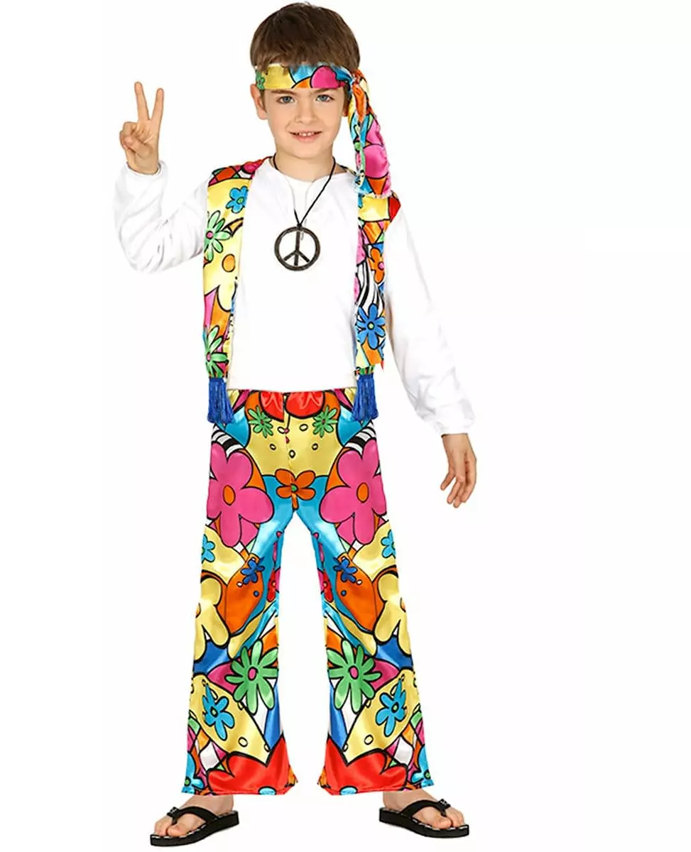 Vær kul! Dette hippiekostymet for barn består av en tunika med vest, pannebånd og bukser (halskjede ikke inkludert). Den hvite langermede tunikaen er dekorert med en falsk vest sydd over toppen, som er dekorert med blå frynser nederst. Pannebåndet, buksene og vesten er laget av et flerfarget stoff med design av store blomster. Dette hippiekostymet vil være perfekt for barnet ditt på en fest eller karneval med 60- og 70-tallstema. Inkludert tilbehør: Bukser Pannebånd T-skjorte med vest Materiale: 100 % polyester Vedlikehold: Håndvask