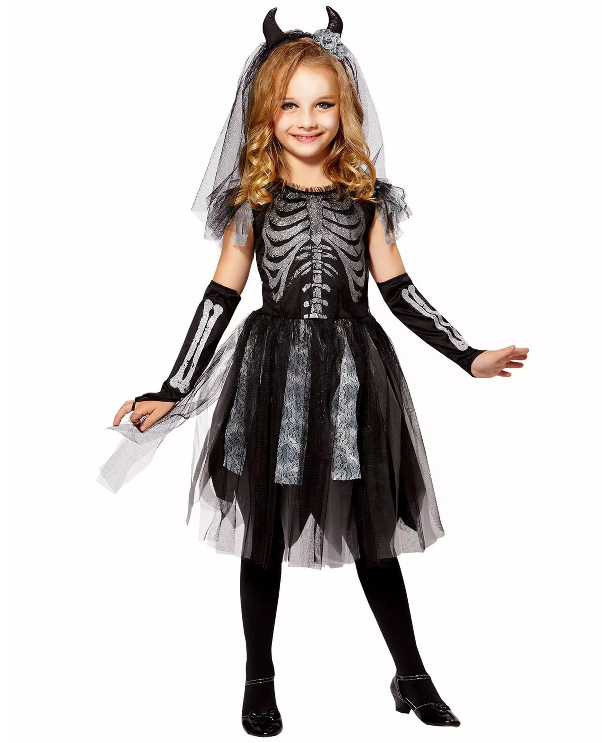 Barnet ditt vil bli den vakreste skjelett-demonbruden! Dette skjelett-demonbrudkostymet er for barn, og det består av en kjole, votter og et brudeslør med horn (strømpebukser ikke inkludert). Kjolen er svart med skjeletttrykk og et svart skjørt. Skjørtet er fôret med svart og grå tyll som også dekker skuldrene. Vottene er svarte med skjeletttrykk, og de er festet til langfingeren. Brudesløret med horn er svart, noe som gir det ønskede demonutseendet. Dette skjelett-demonbrudkostymet vil være perfekt til Halloween. Inkludert tilbehør: Kjole Votter Slør med horn Materiale: 100 % polyester Vedlikehold: Håndvask
