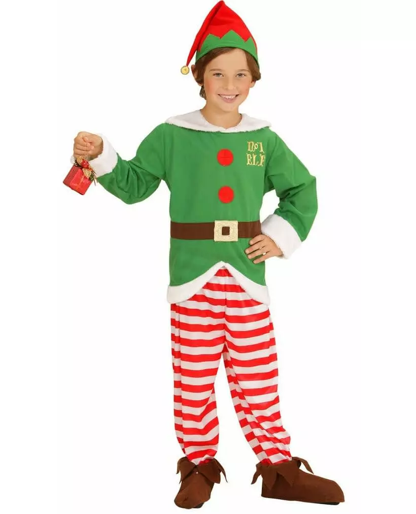 Ekspresslevering av gave! Dette alvkostymet for barn består av en tunika, bukser og en hatt (gave og sko er ikke inkludert). Tunikaen er laget av polyester med fløyelseffekt. Den er hovedsakelig grønn, bortsett fra ermene, kragen og bunnen hvor det er hvit fuskepels. Knapper av fuskefilt er limt i midten. Et fuskebrunt belte med en gullfarget stoffspenne fremhever midjen. Ordet «alv» er skrevet i gull på brystet av denne jakken. Borrelåsfester på den ensfargede grønne baksiden gjør det enkelt å ta på t-skjorten. De elastiske buksene er laget av fin polyester med røde og hvite striper. Hatten matcher t-skjorten. Grønne tupper står i kontrast til det røde, og en falsk bjelle simuleres av en sirkel av gullfarget stoff. Forvandle barnet ditt til en liten alv til jul og på slutten av året for å forberede seg til festlighetene! © Copyright Widmann SRL. Inkludert tilbehør: Tunikabukser Hatt Materiale: Polyester Vedlikehold: Håndvask